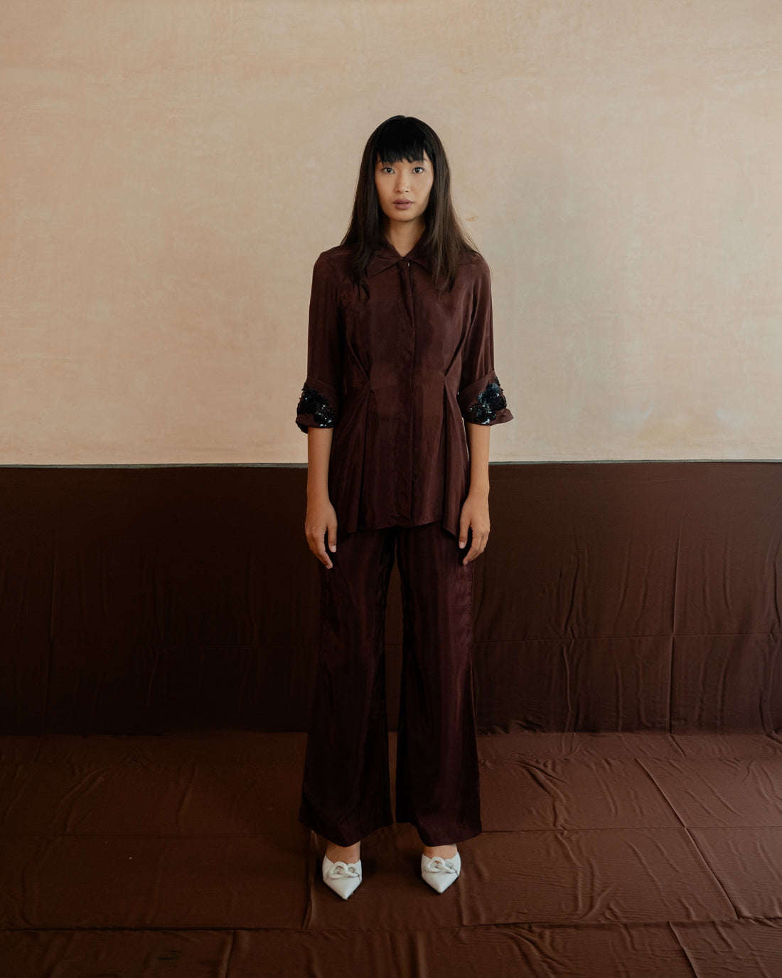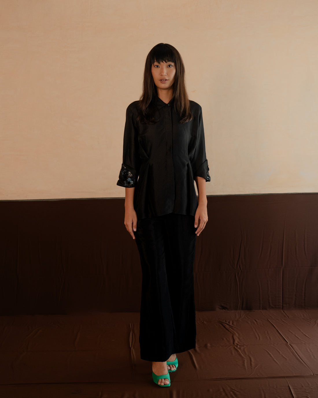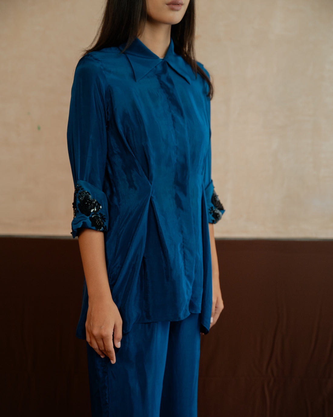 This co-ord set features a chic shirt with oversized embroidered cuff and two inverted box...