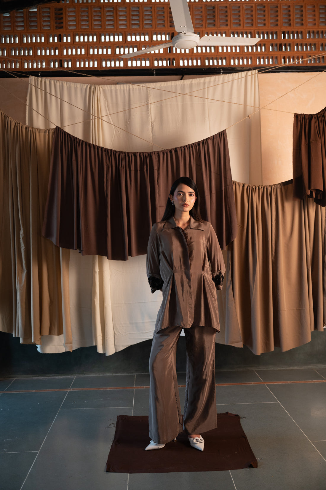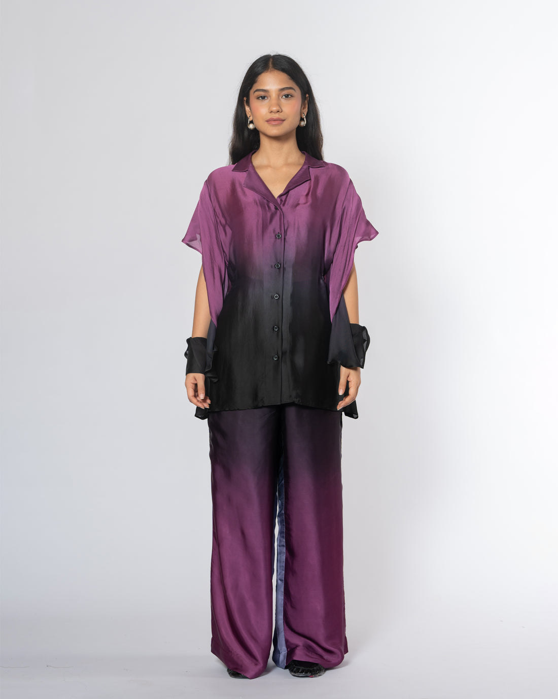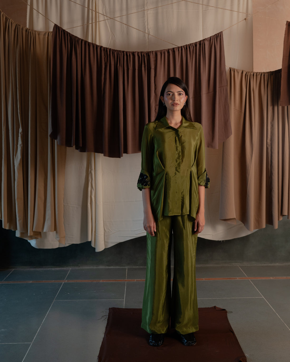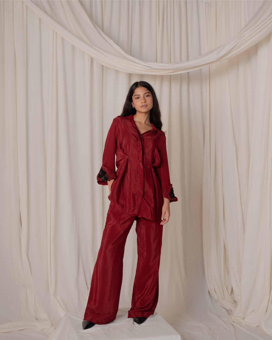 This co-ord set features a chic shirt with oversized embroidered cuff and two inverted box...