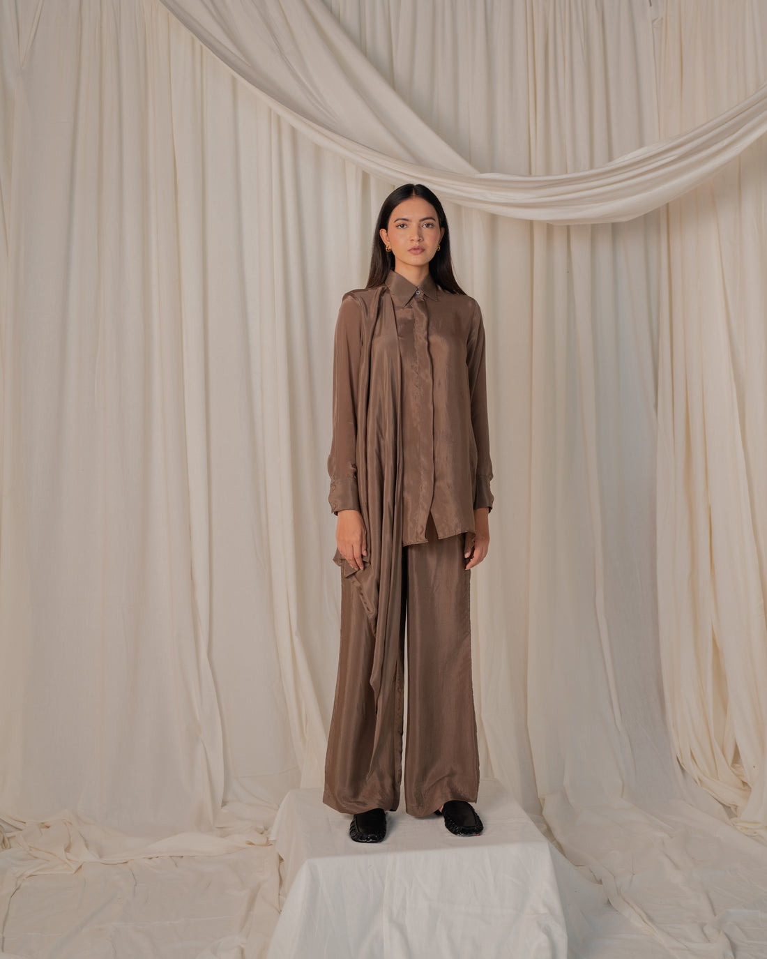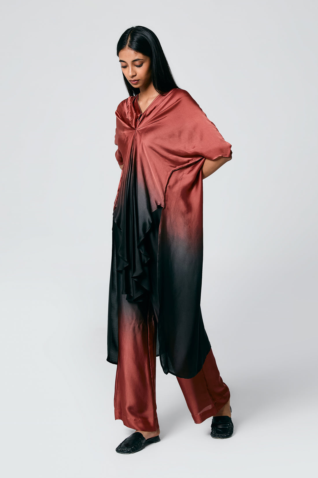 This ensemble features a fluid tunic with a knot detail at the neckline, creating soft...