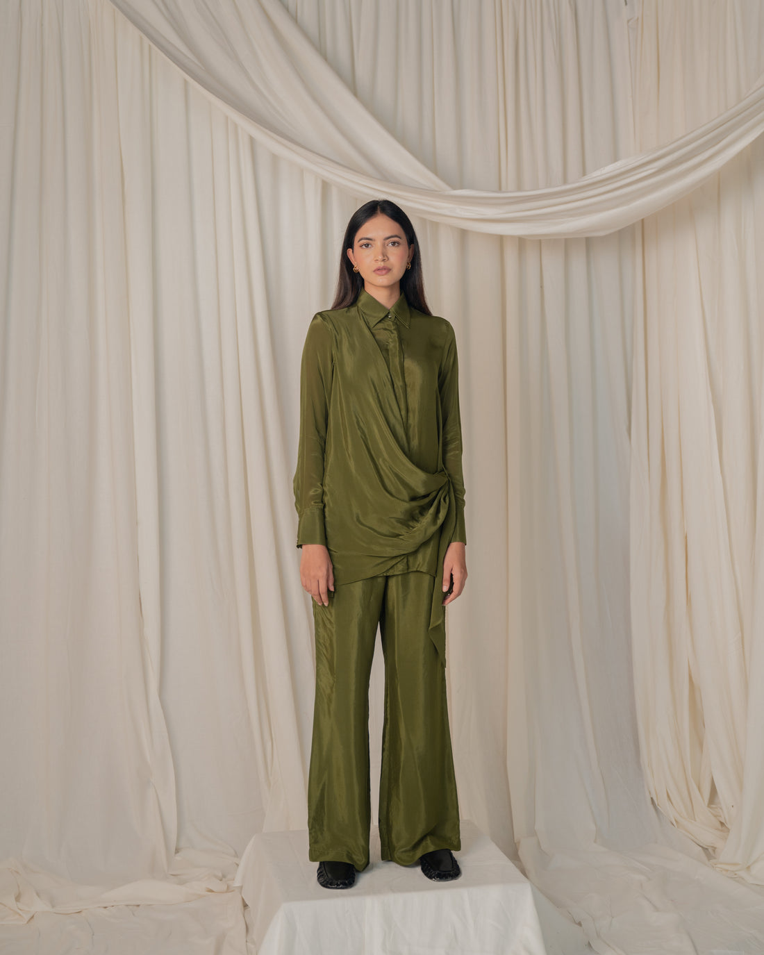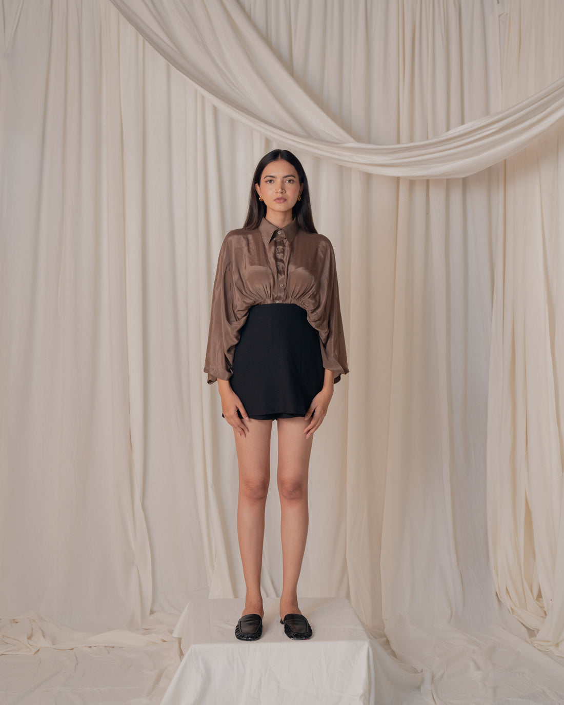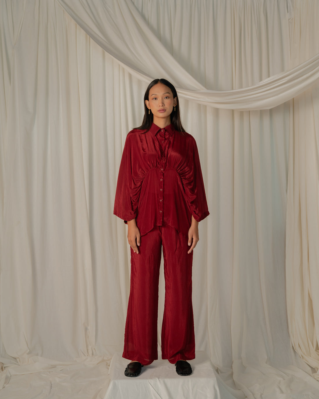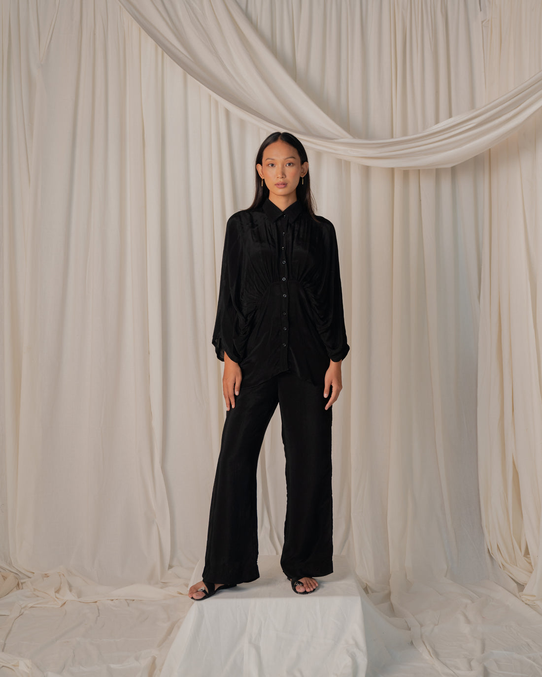 This shirt is designed with elegant gathers from the waist up and a sleek straight...