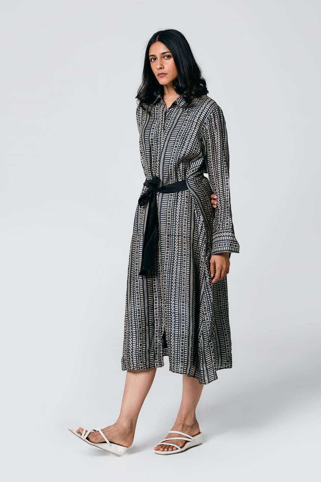 This contemporary shirt dress fuses clean tailoring with a dynamic twist, featuring bold Ajrakh stripes...