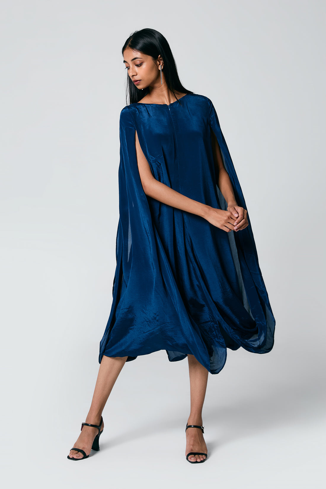 A statement-making draped dress that merges fluid form with bold silhouette. It features a relaxed...
