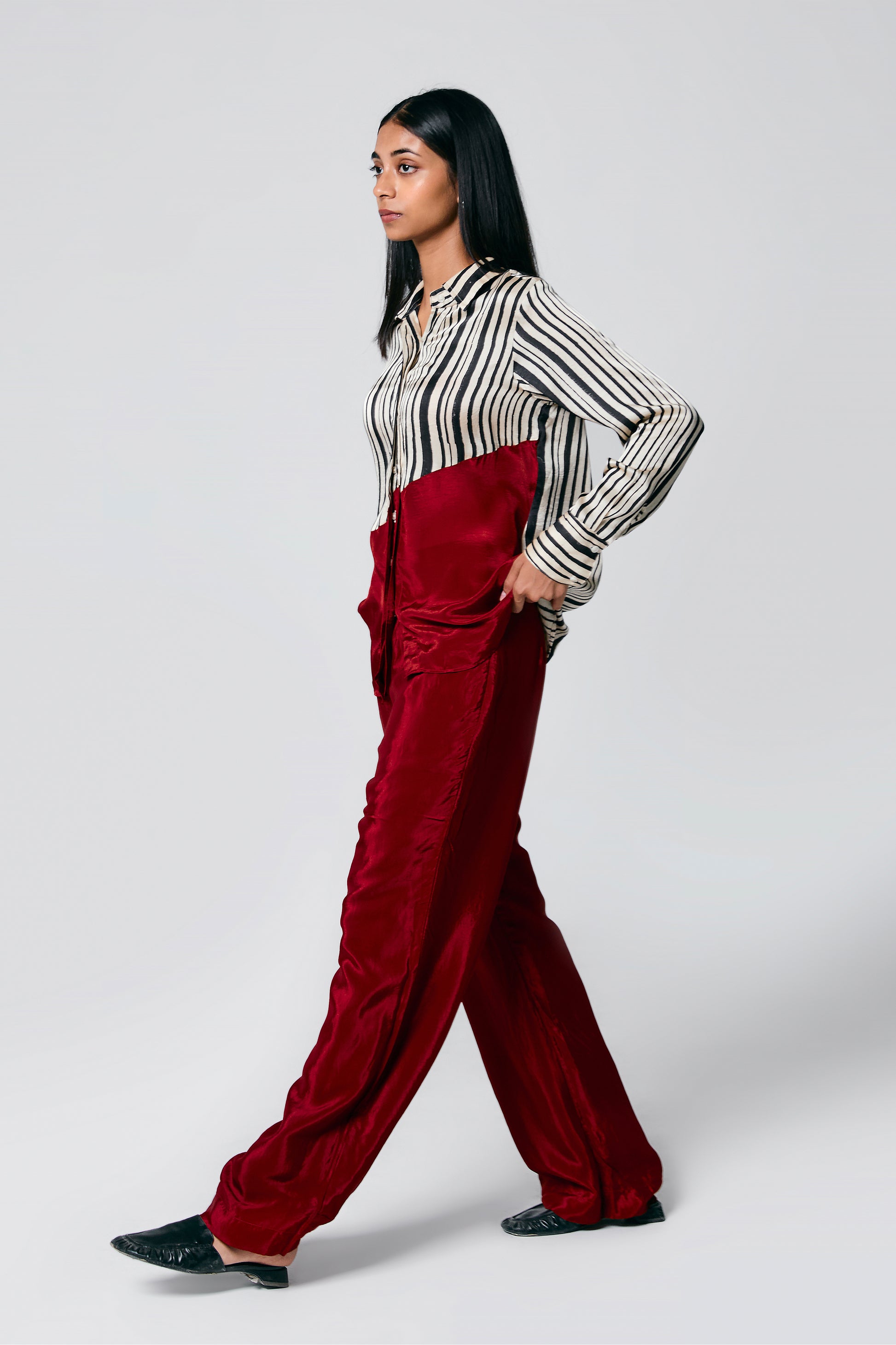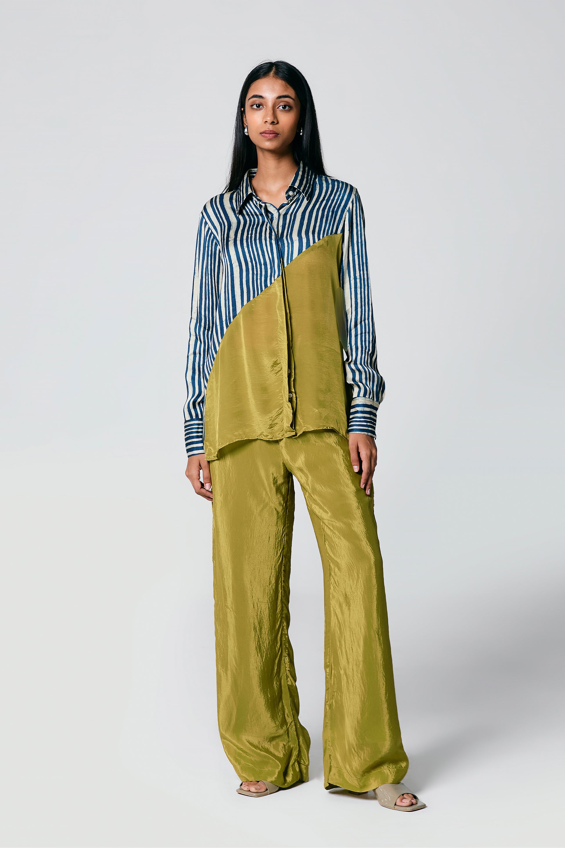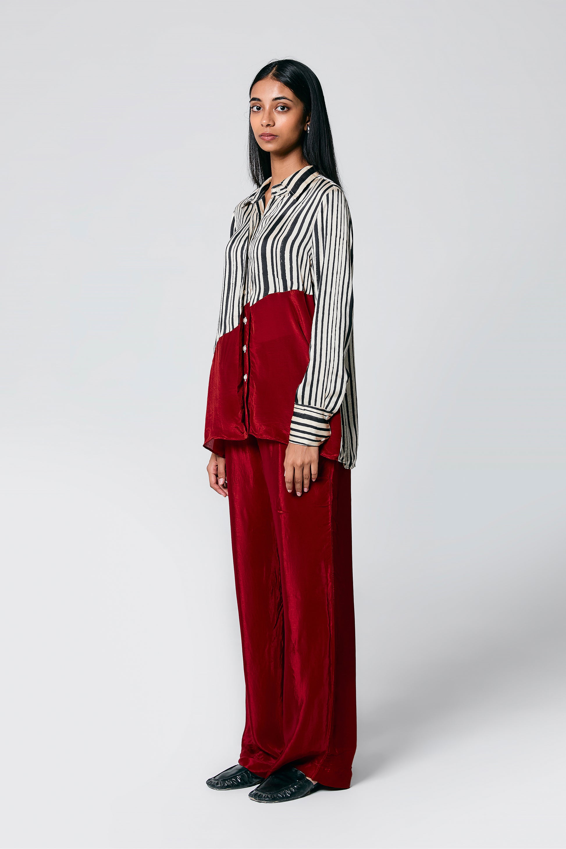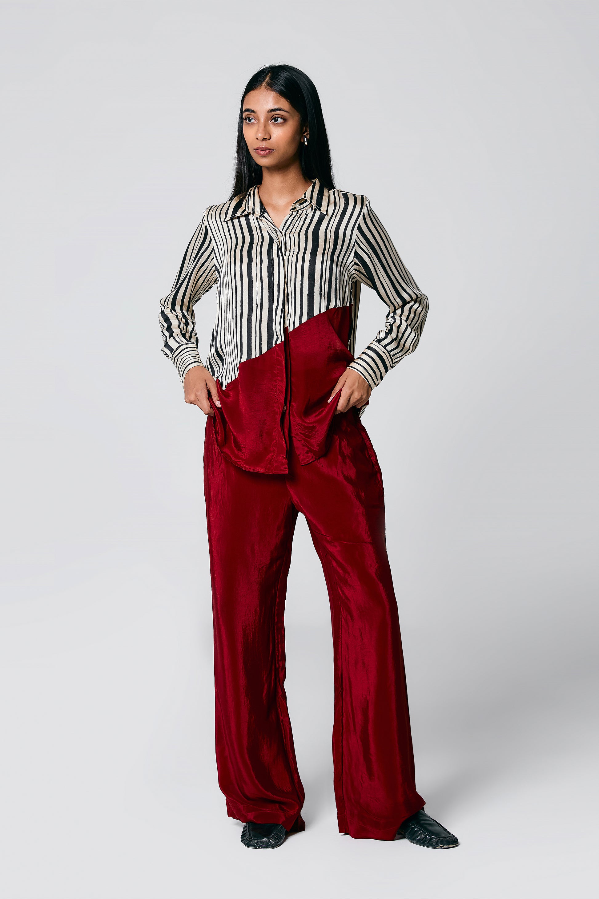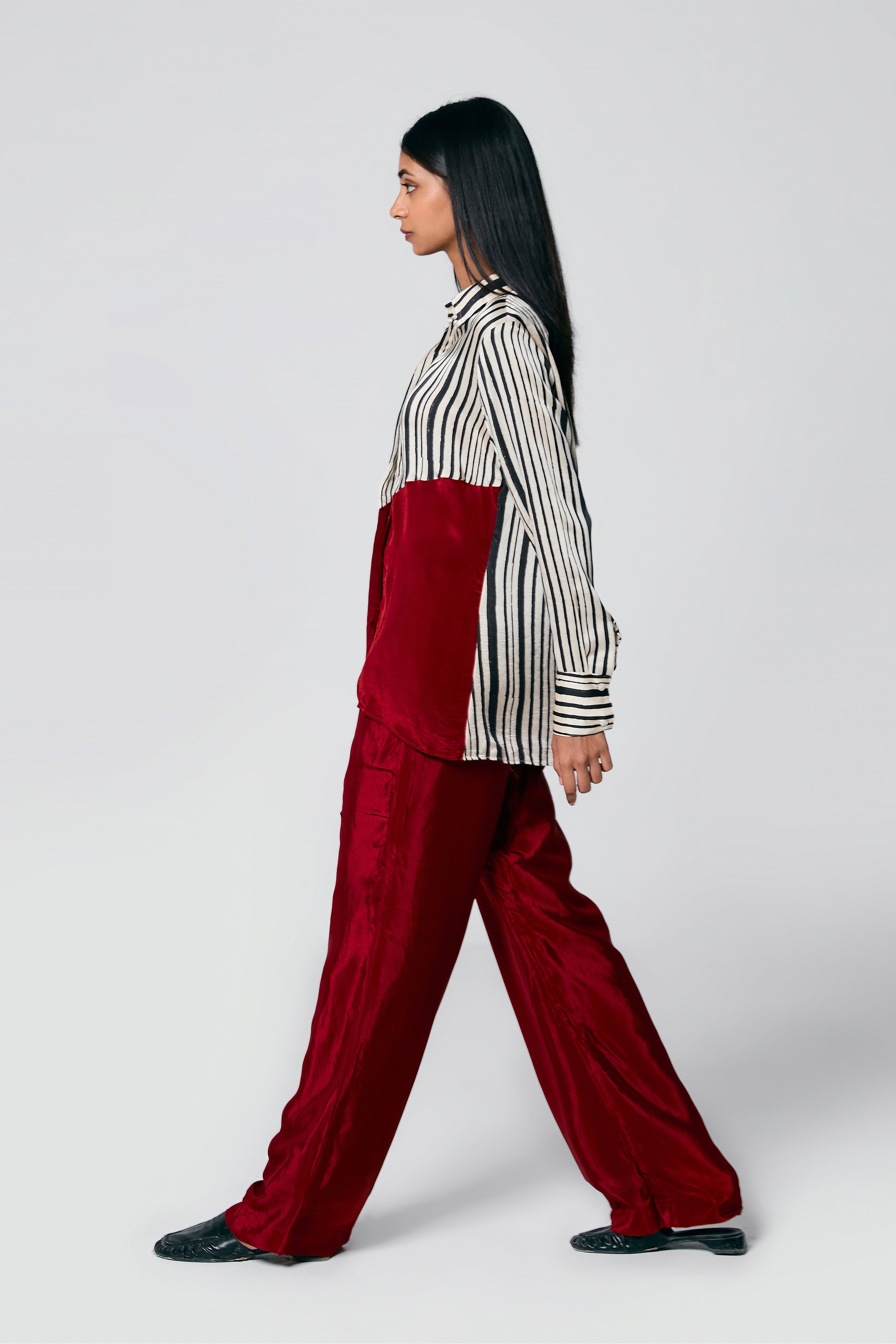 This shirt co-ord set features a contemporary silhouette elevated by traditional striped Ajrakh block printing. The shirt is designed with a unique diagonal solid panel that adds contrast and edge, paired effortlessly with flowing wide-leg pants for a minimal yet striking ensemble.
