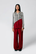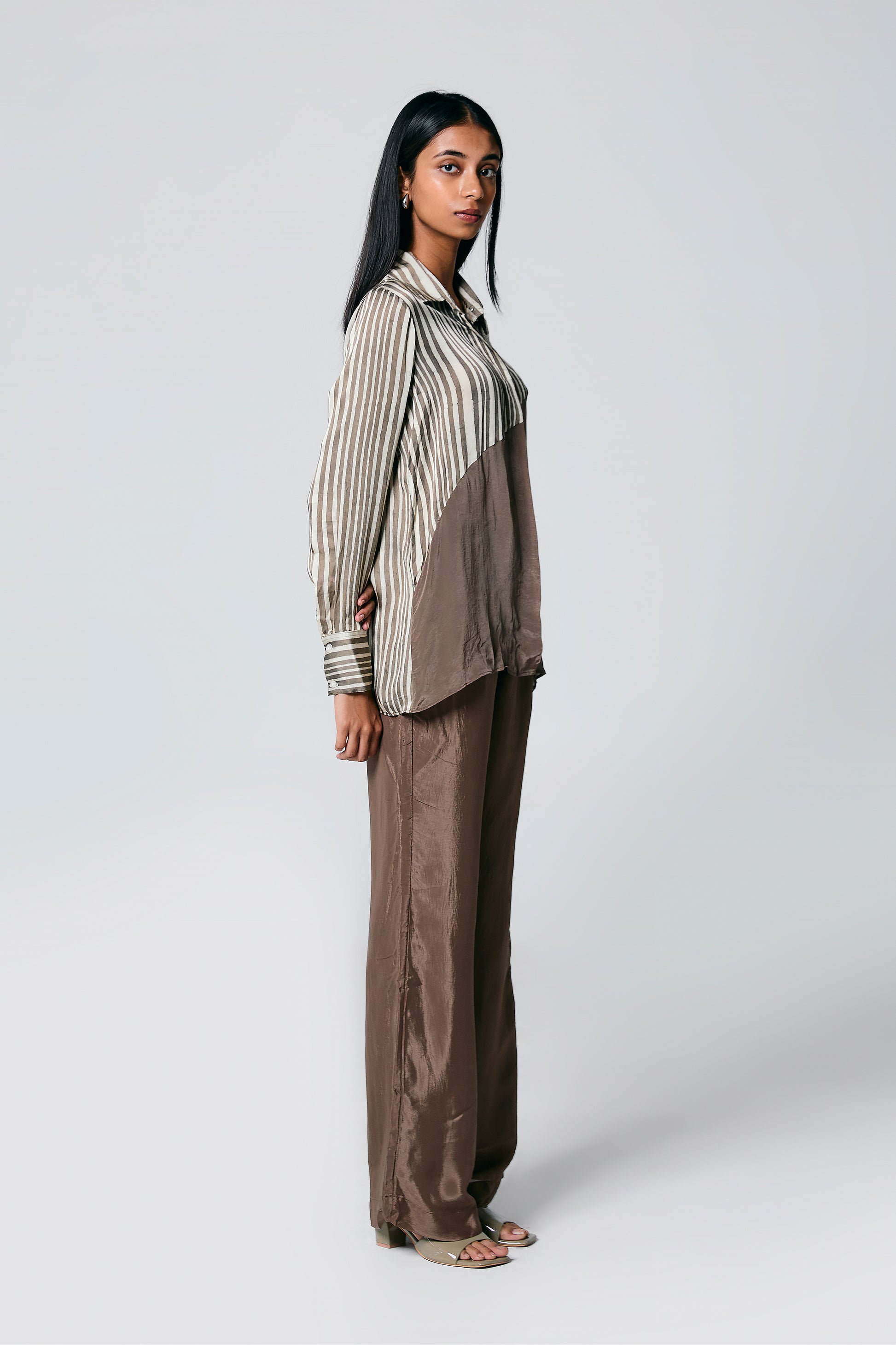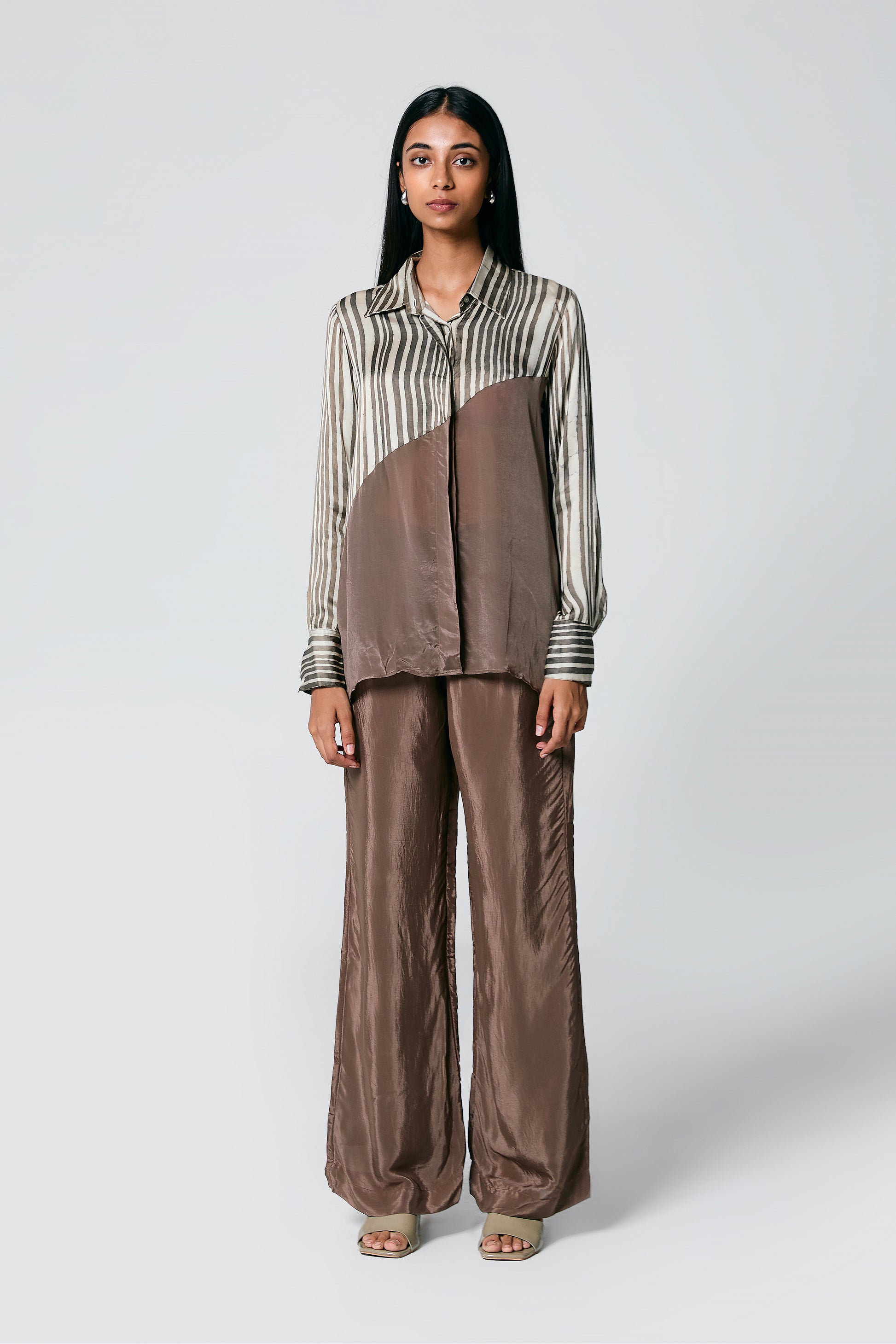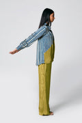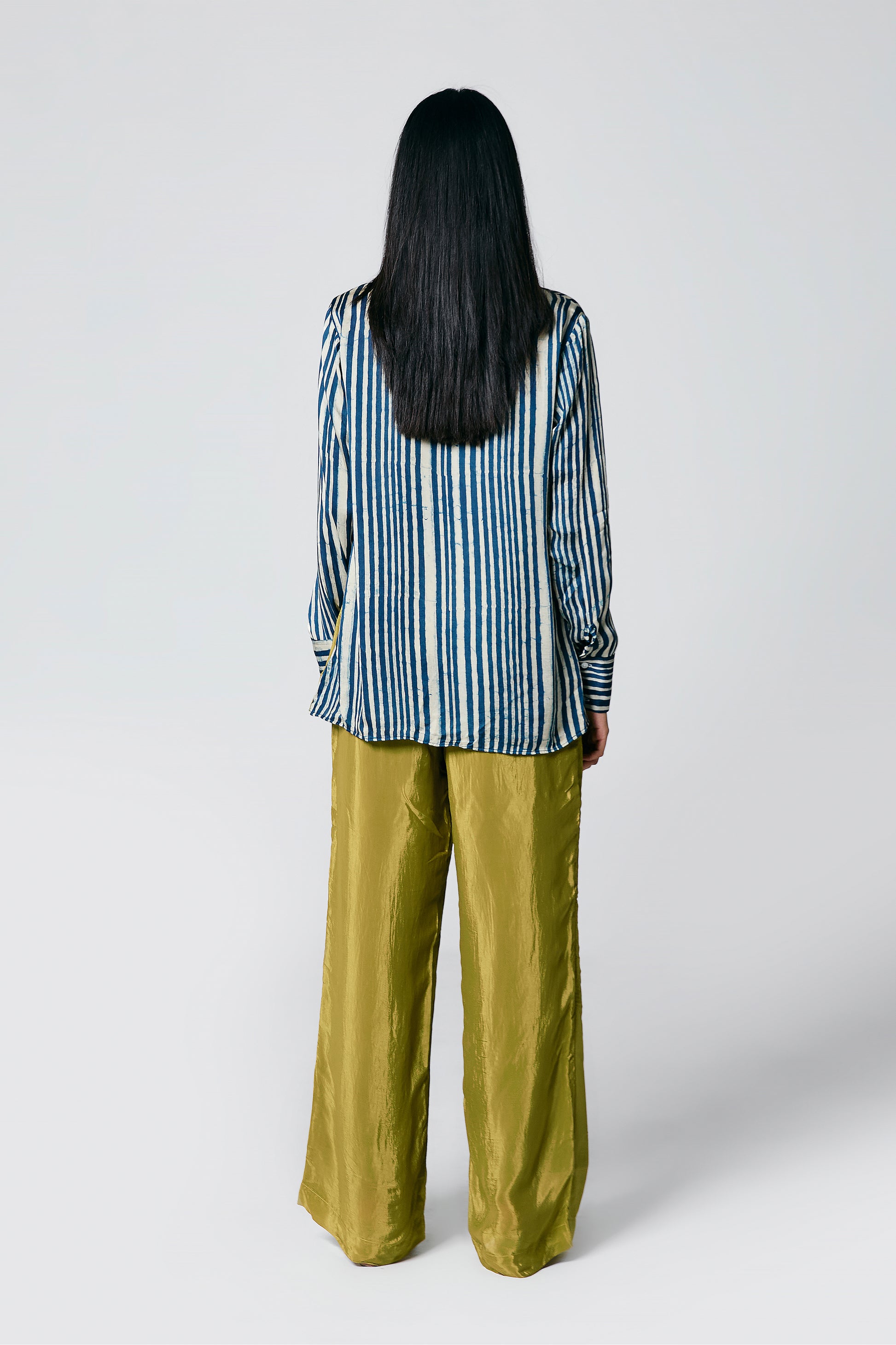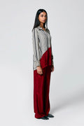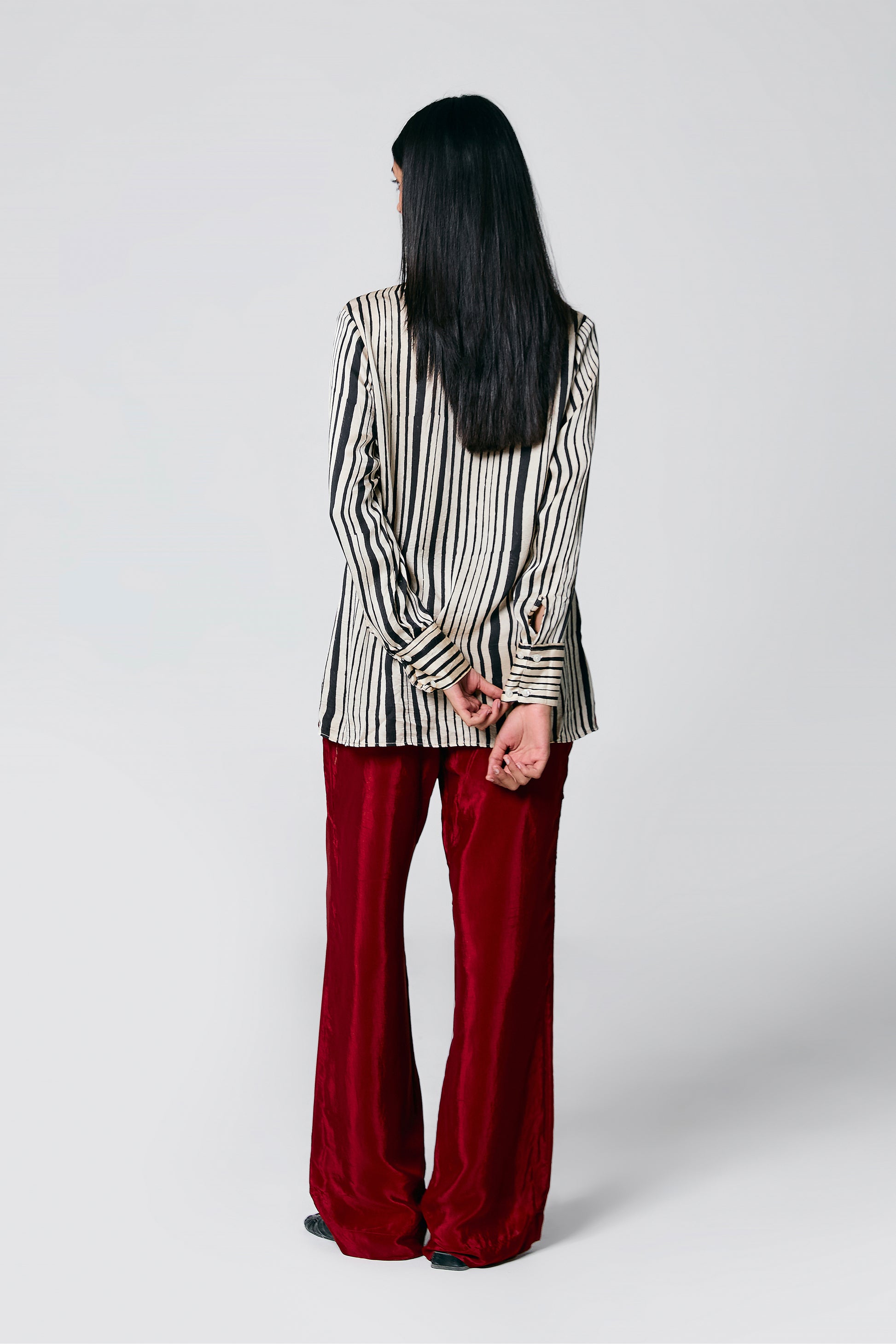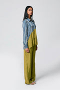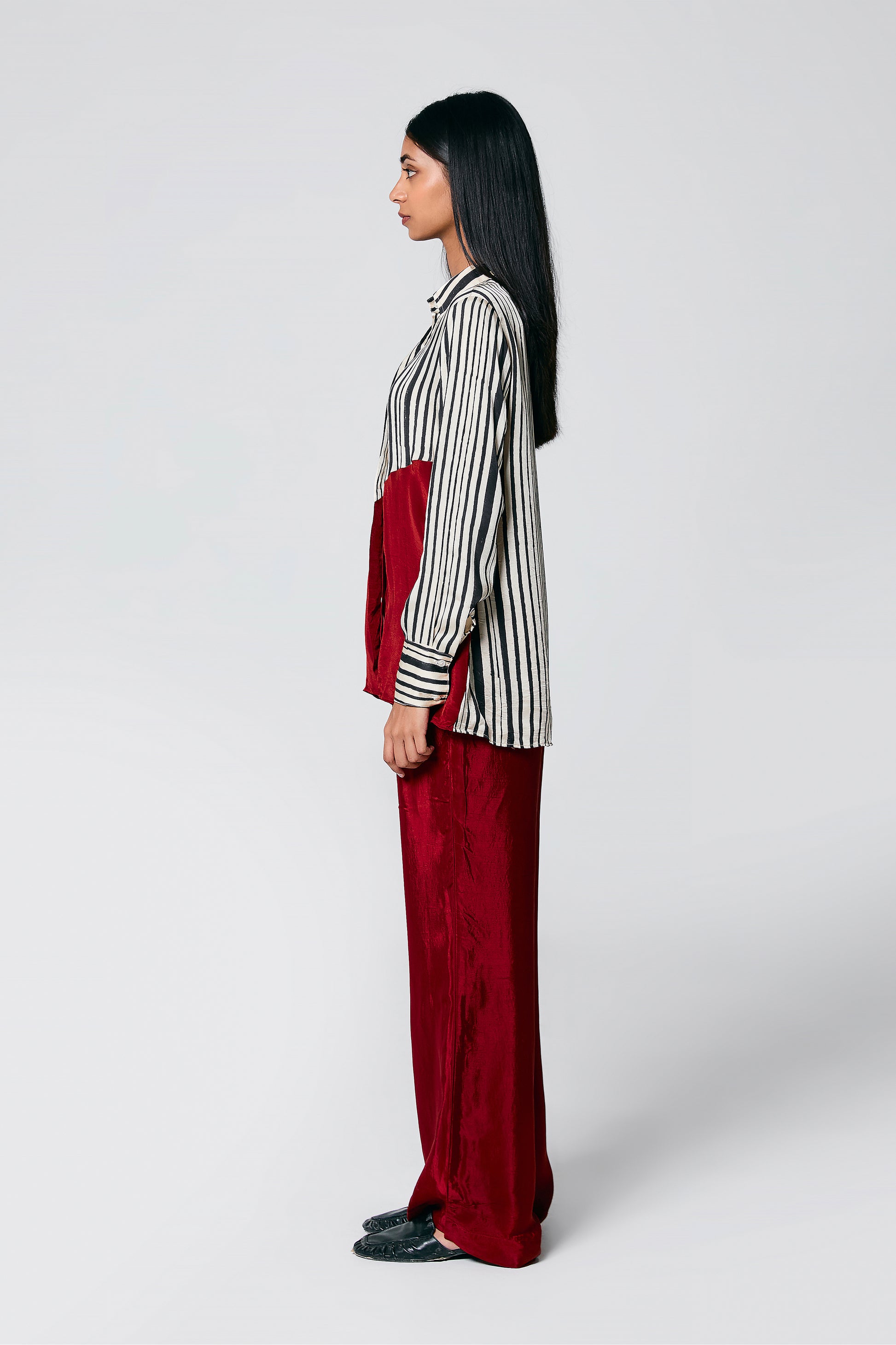 This shirt co-ord set features a contemporary silhouette elevated by traditional striped Ajrakh block printing. The shirt is designed with a unique diagonal solid panel that adds contrast and edge, paired effortlessly with flowing wide-leg pants for a minimal yet striking ensemble.