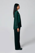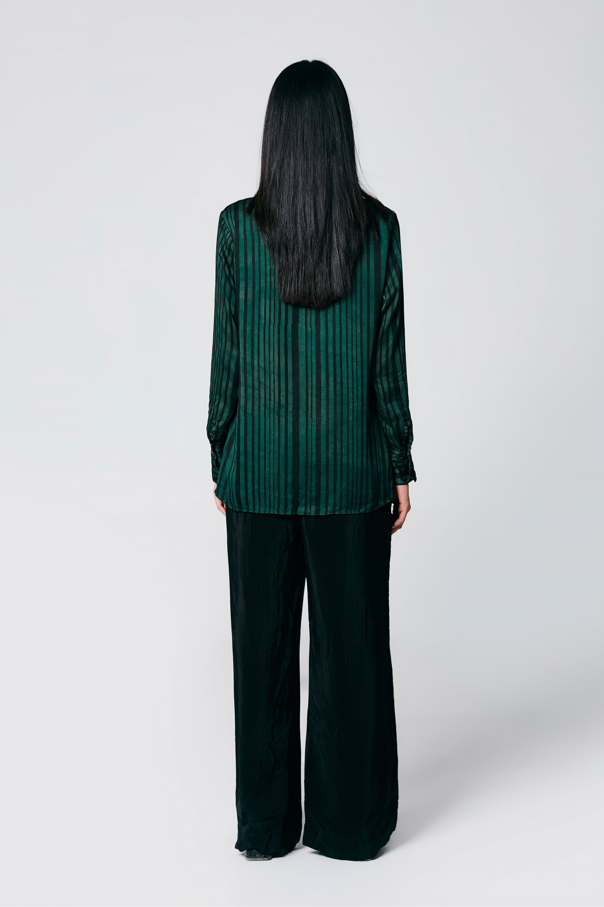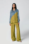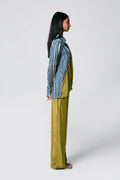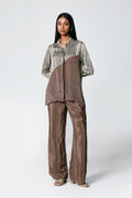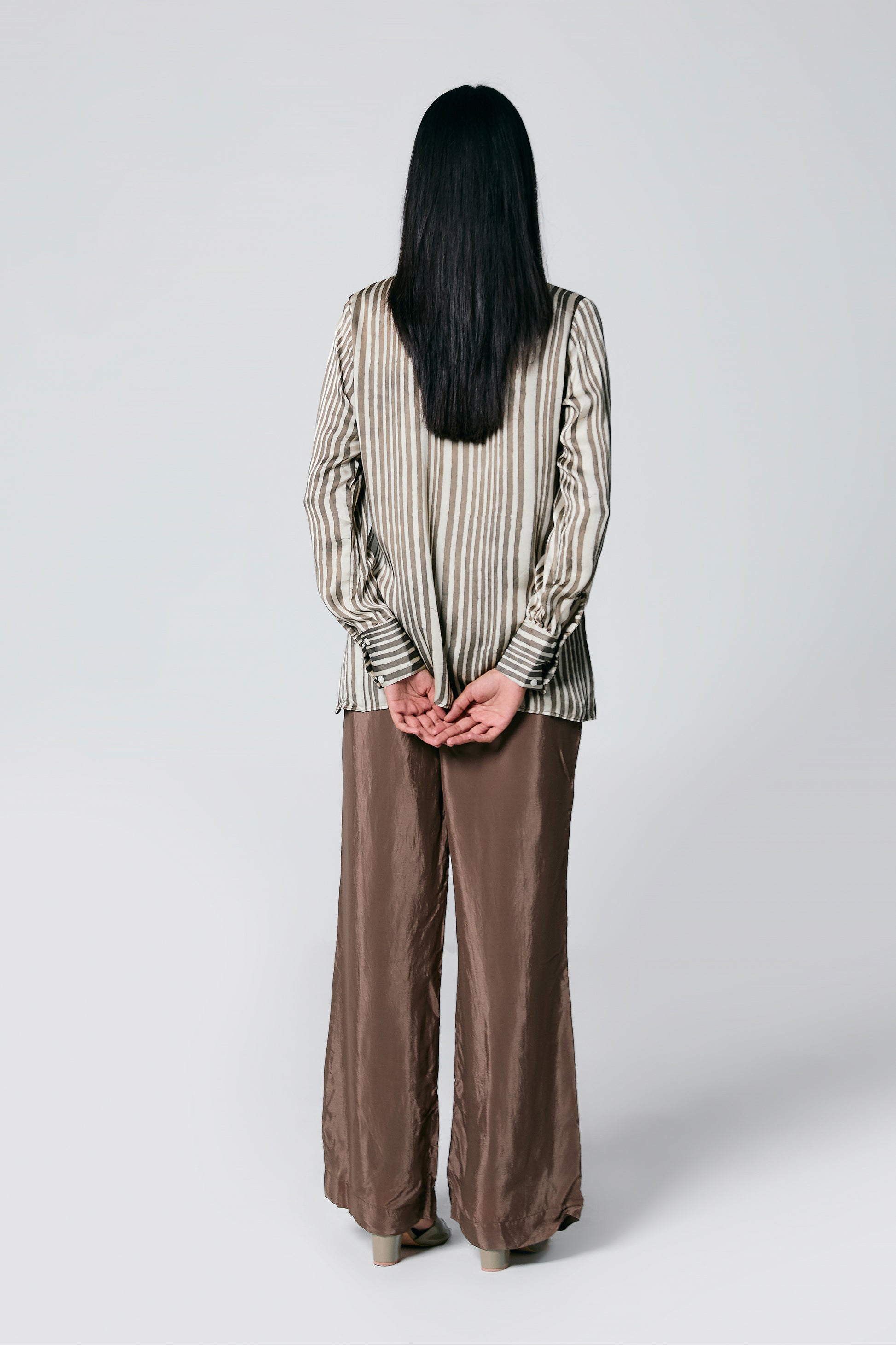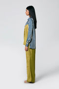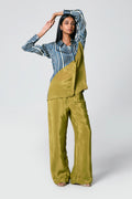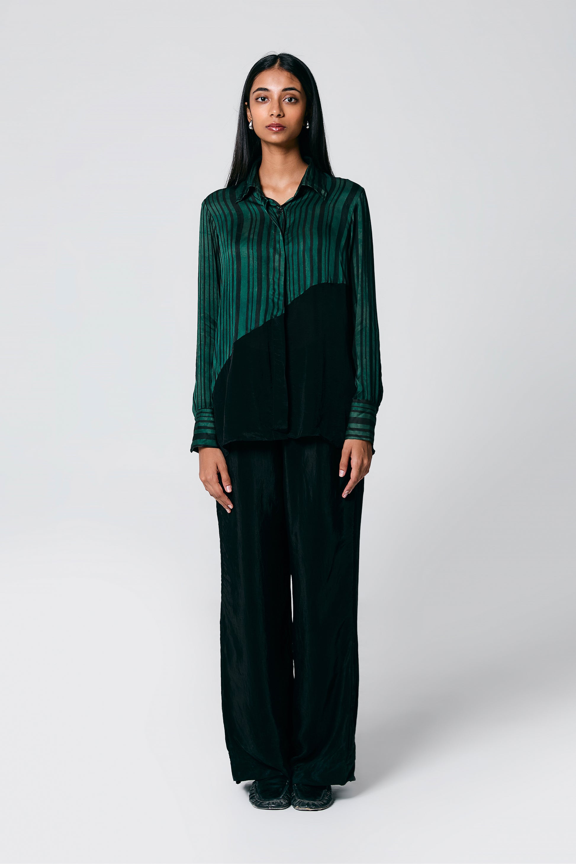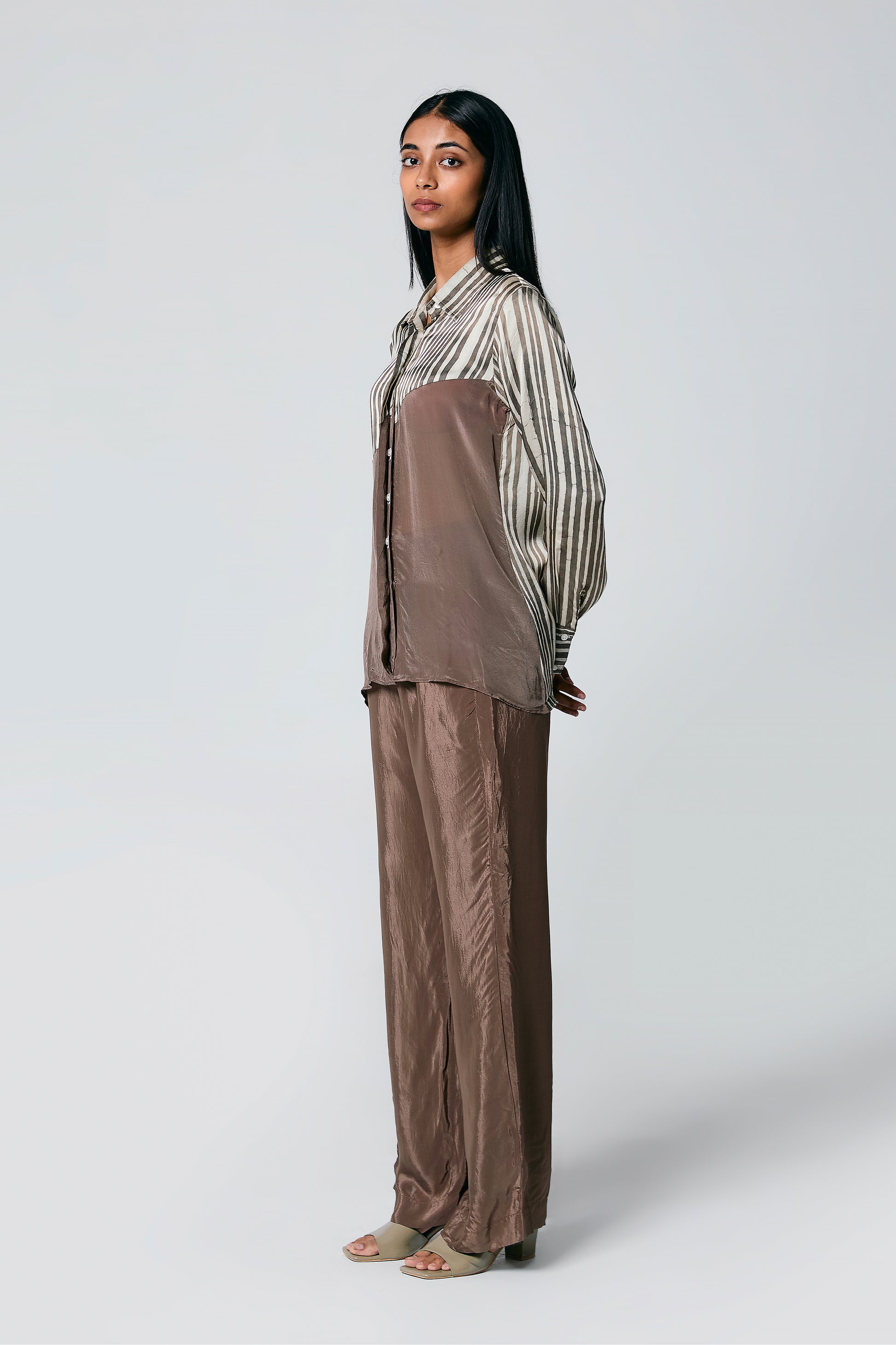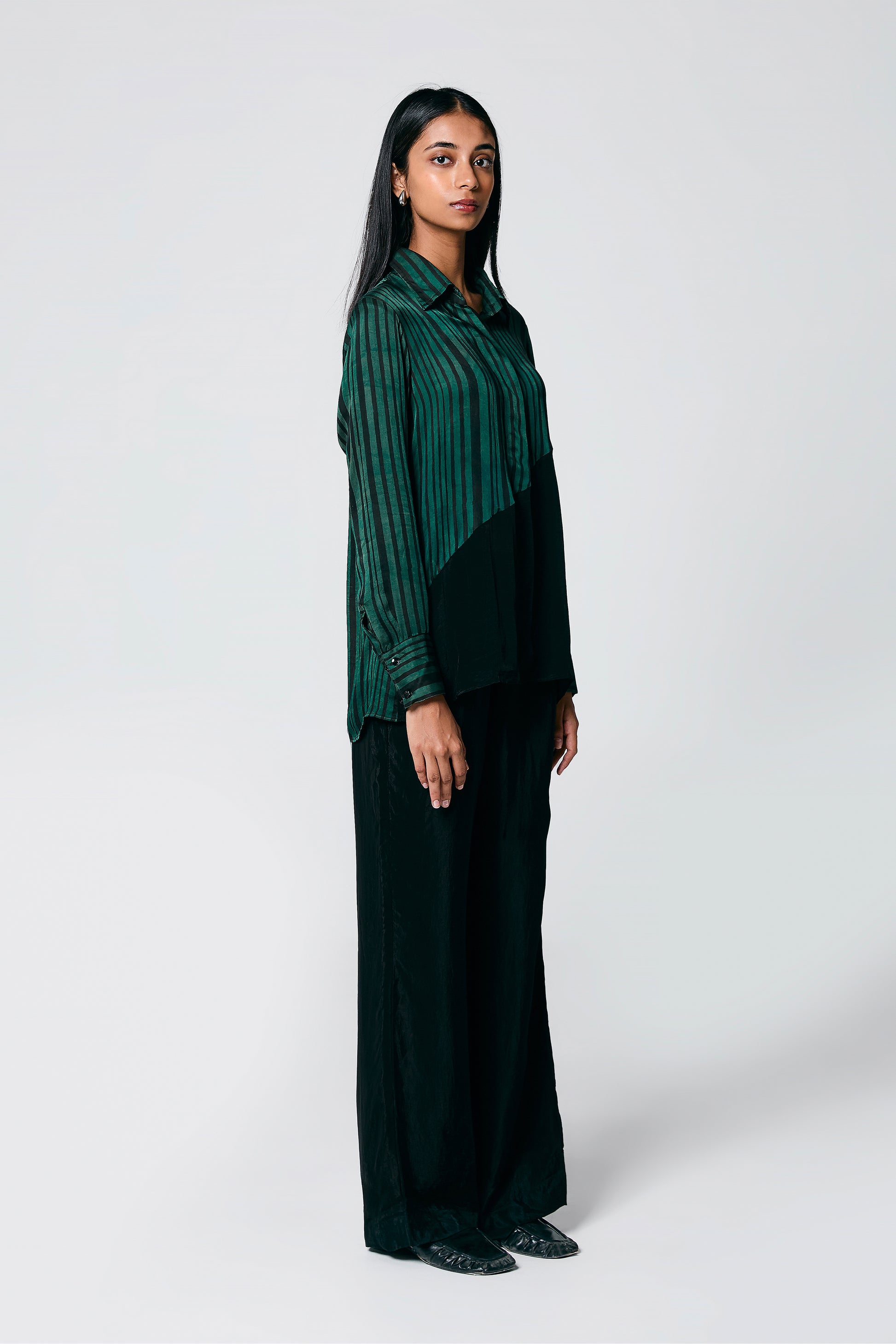 This shirt co-ord set features a contemporary silhouette elevated by traditional striped Ajrakh block printing. The shirt is designed with a unique diagonal solid panel that adds contrast and edge, paired effortlessly with flowing wide-leg pants for a minimal yet striking ensemble.