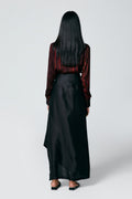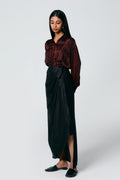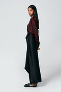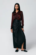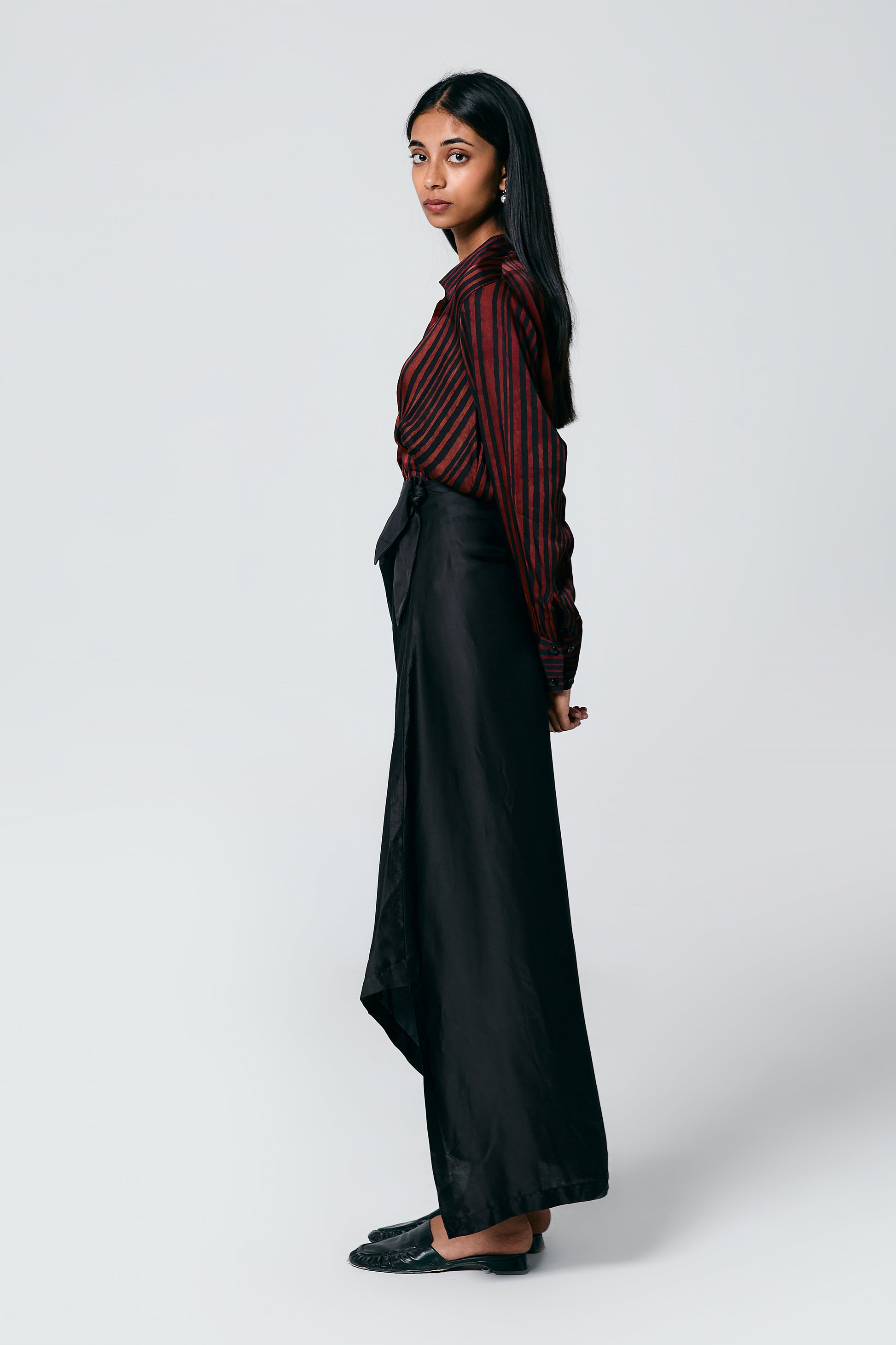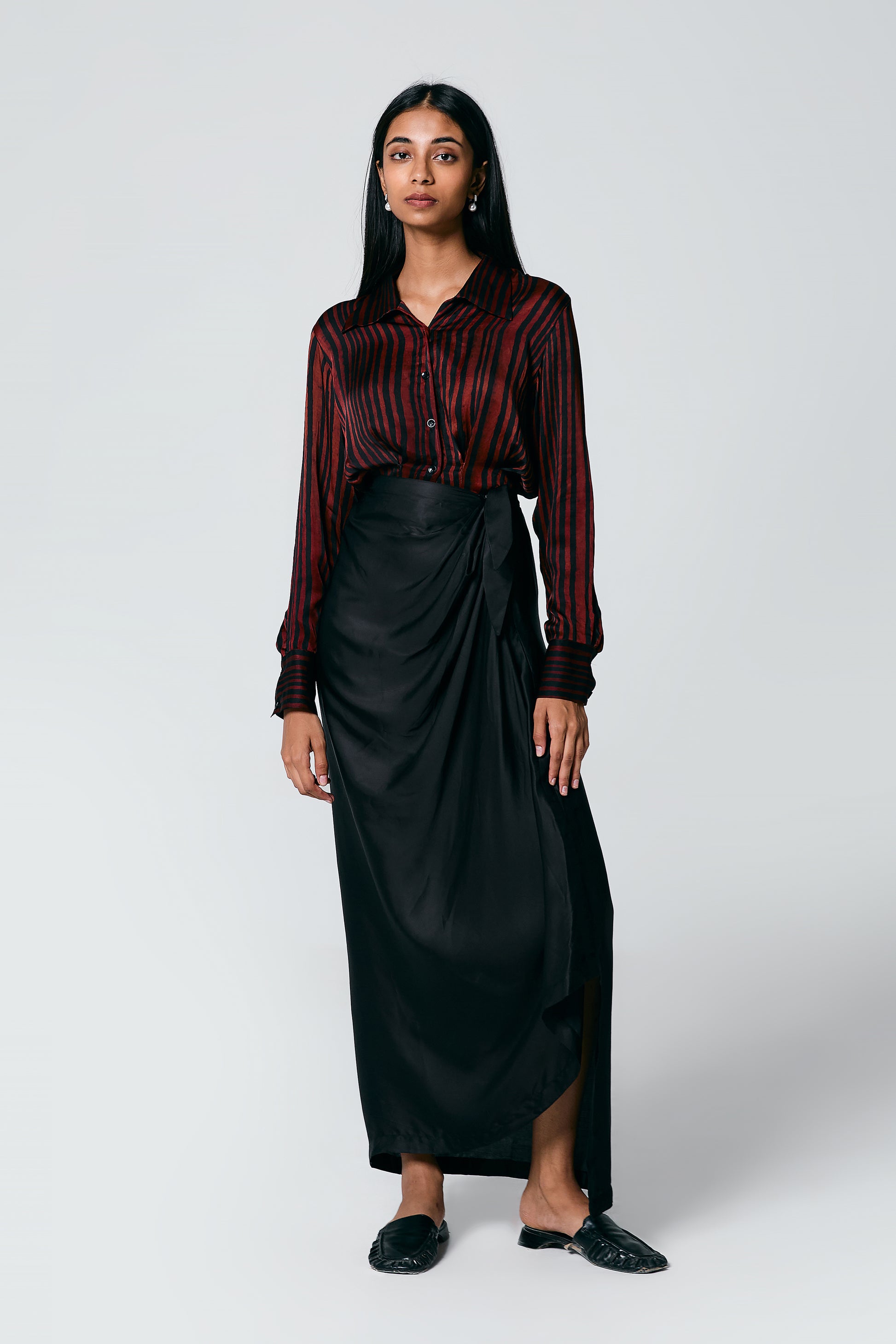 This effortlessly polished co-ord set pairs a structured striped button-down shirt with a fluid, draped wrap skirt. The subtle sheen of the fabrics adds a hint of luxe, while the vertical stripe print on the shirt brings timeless structure. A minimal yet statement look, perfect for transitioning from day to night with understated elegance.