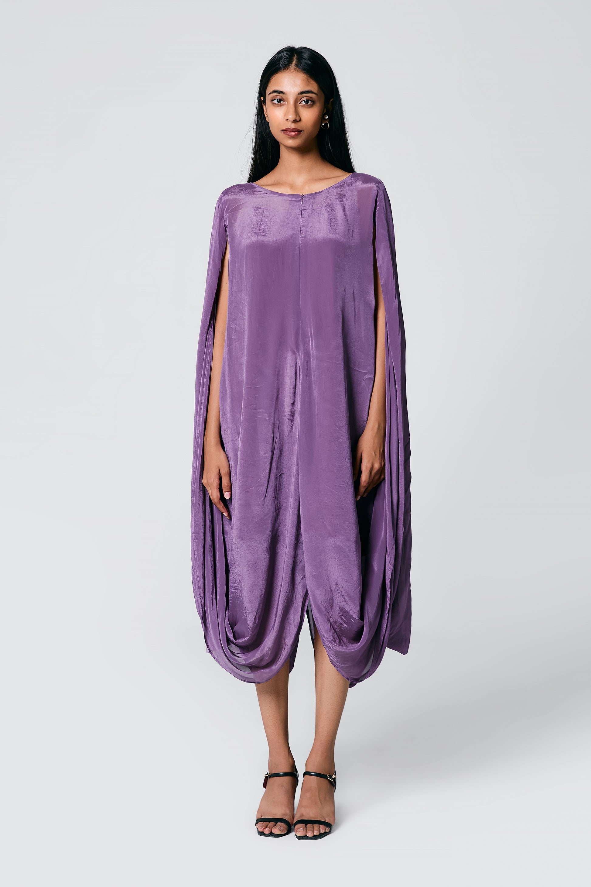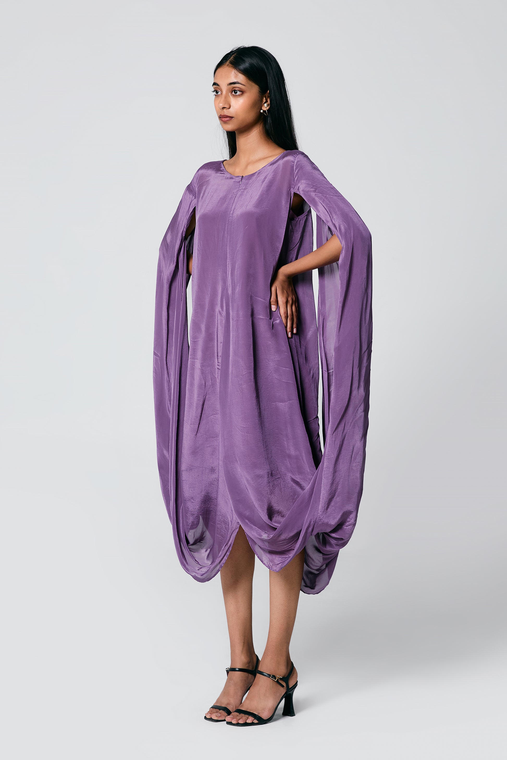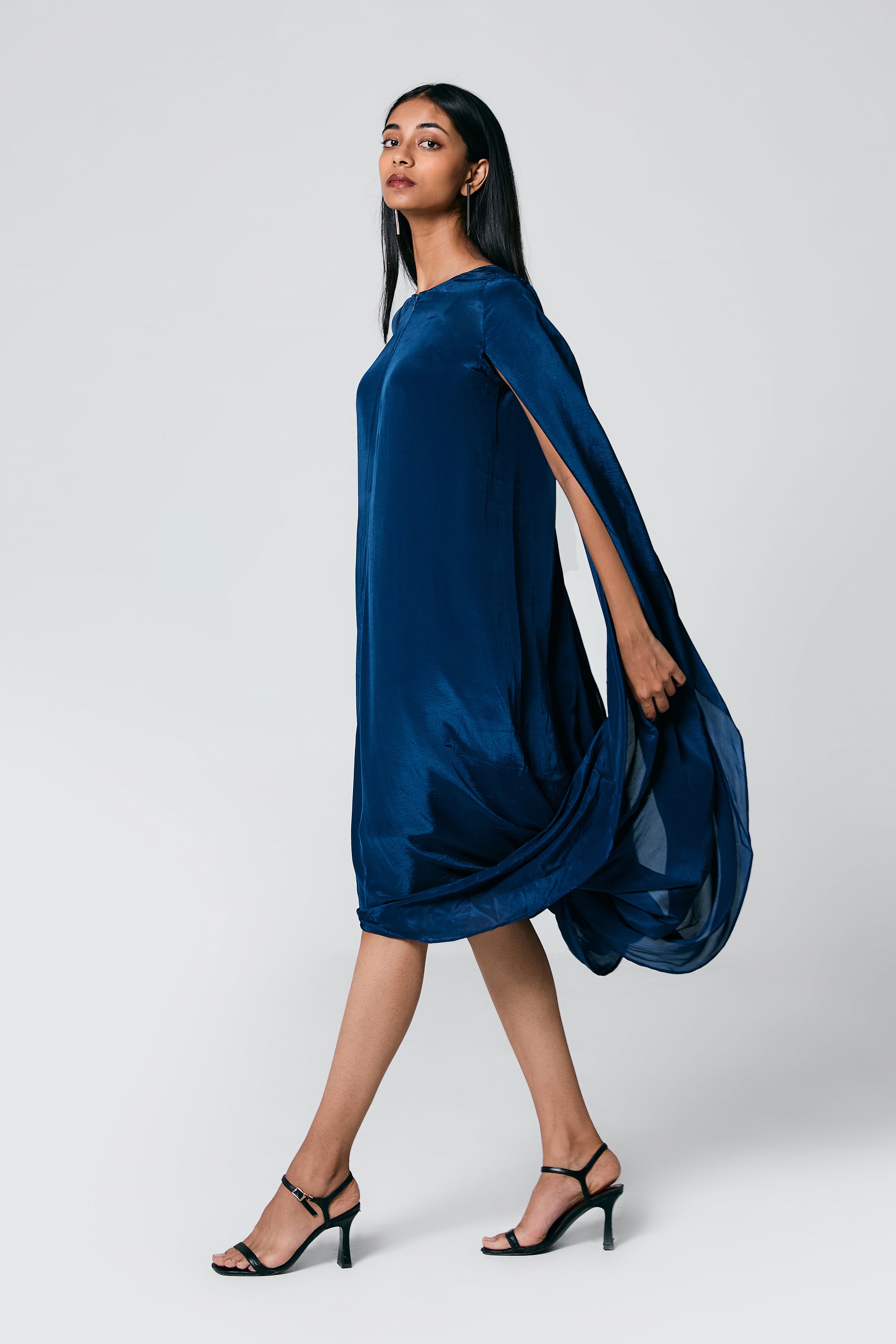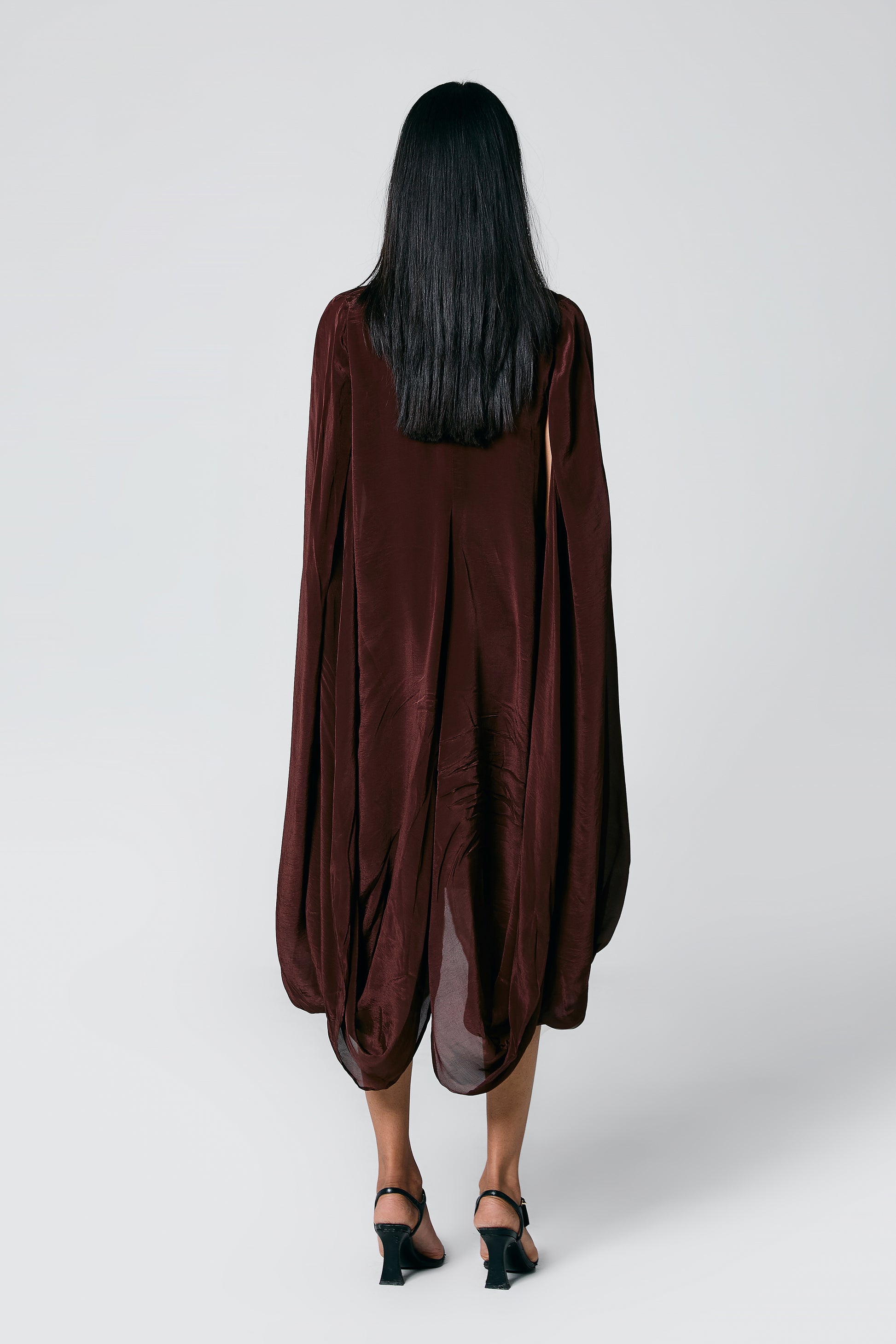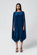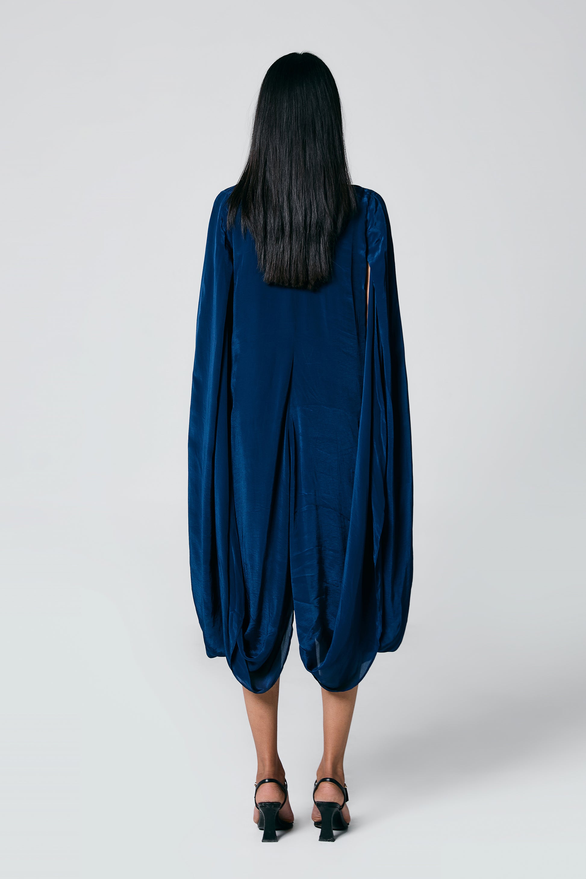 A statement-making draped dress that merges fluid form with bold silhouette. It features a relaxed fit with sculptural cowl details at the legs and dramatic cape-style sleeves that cascade effortlessly.