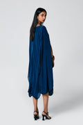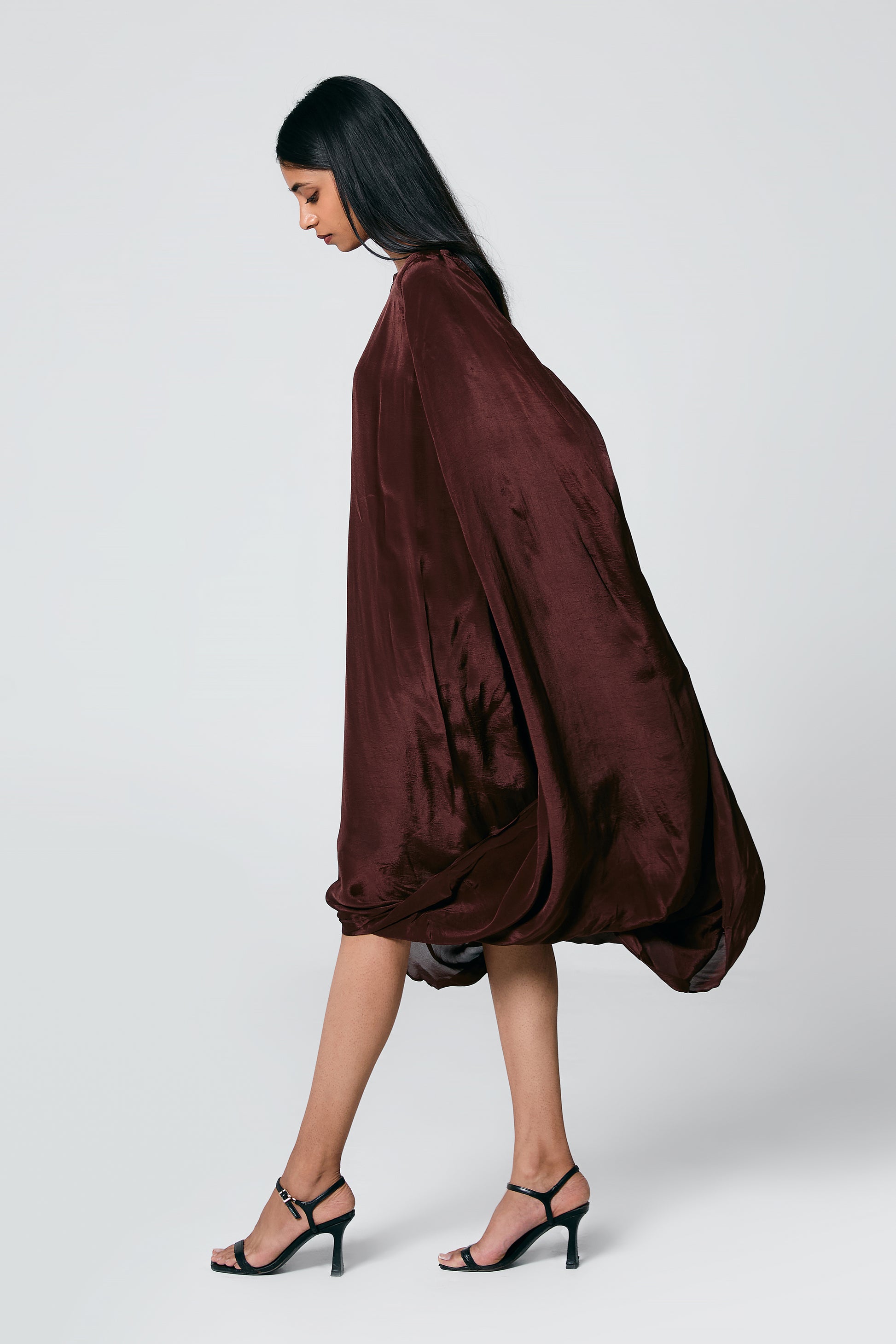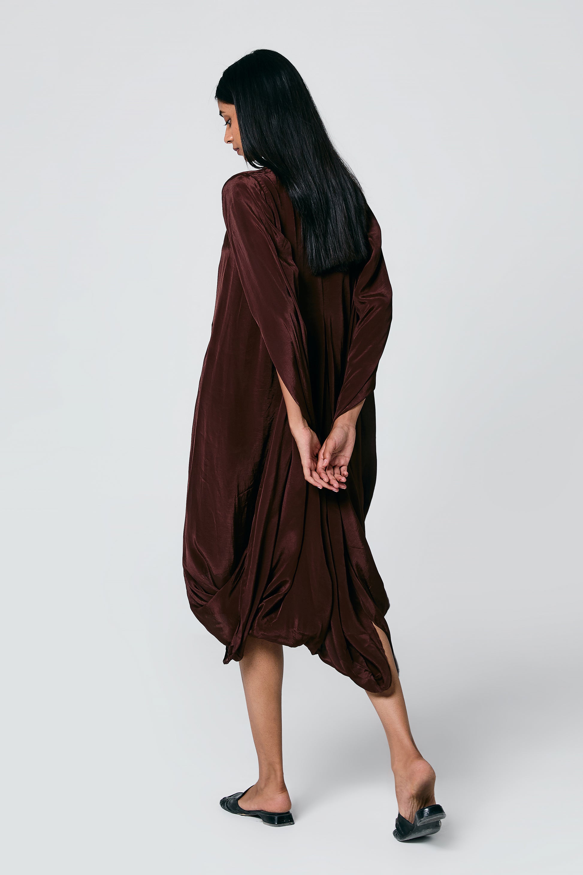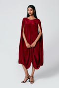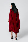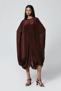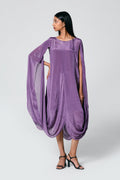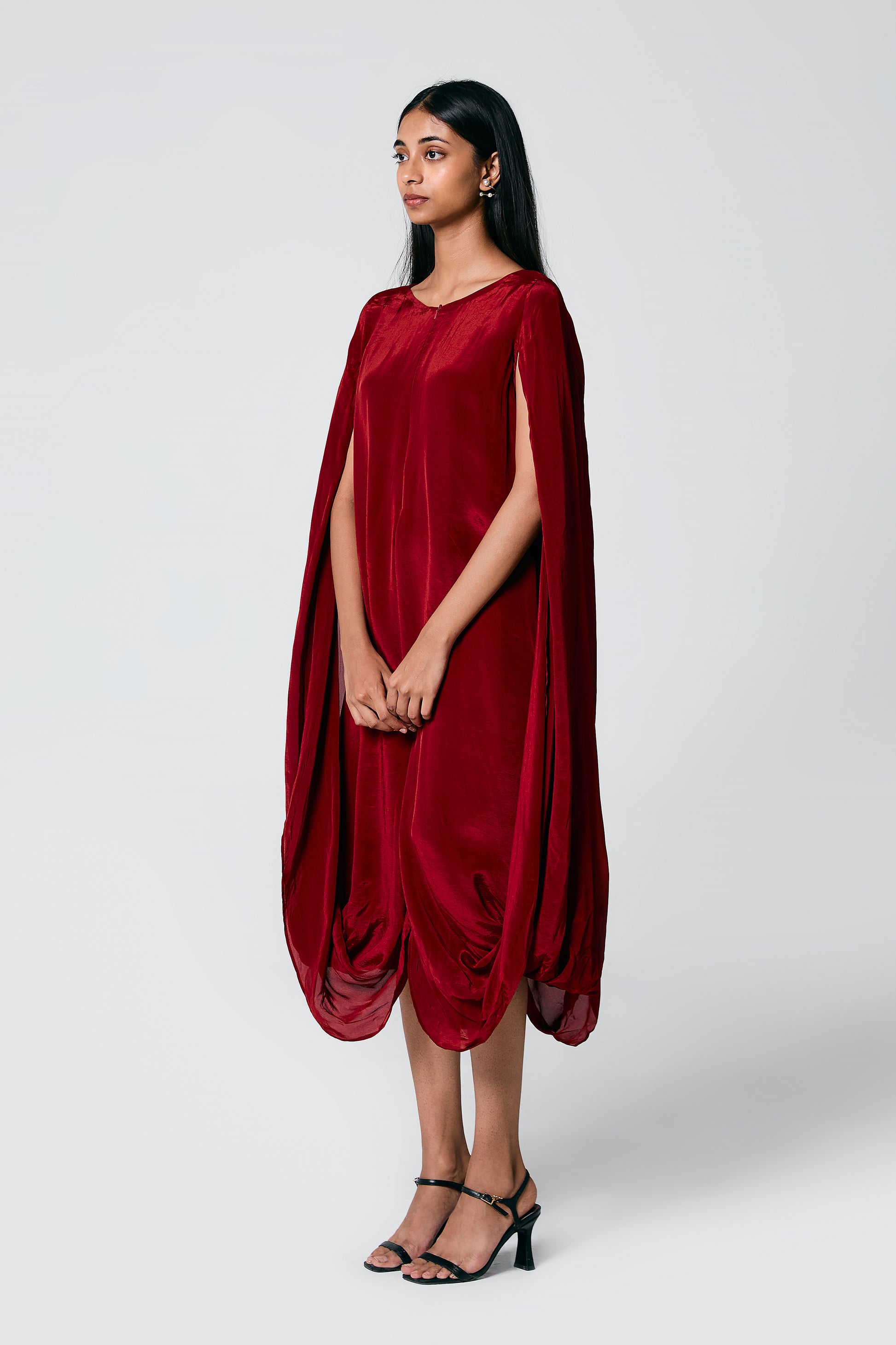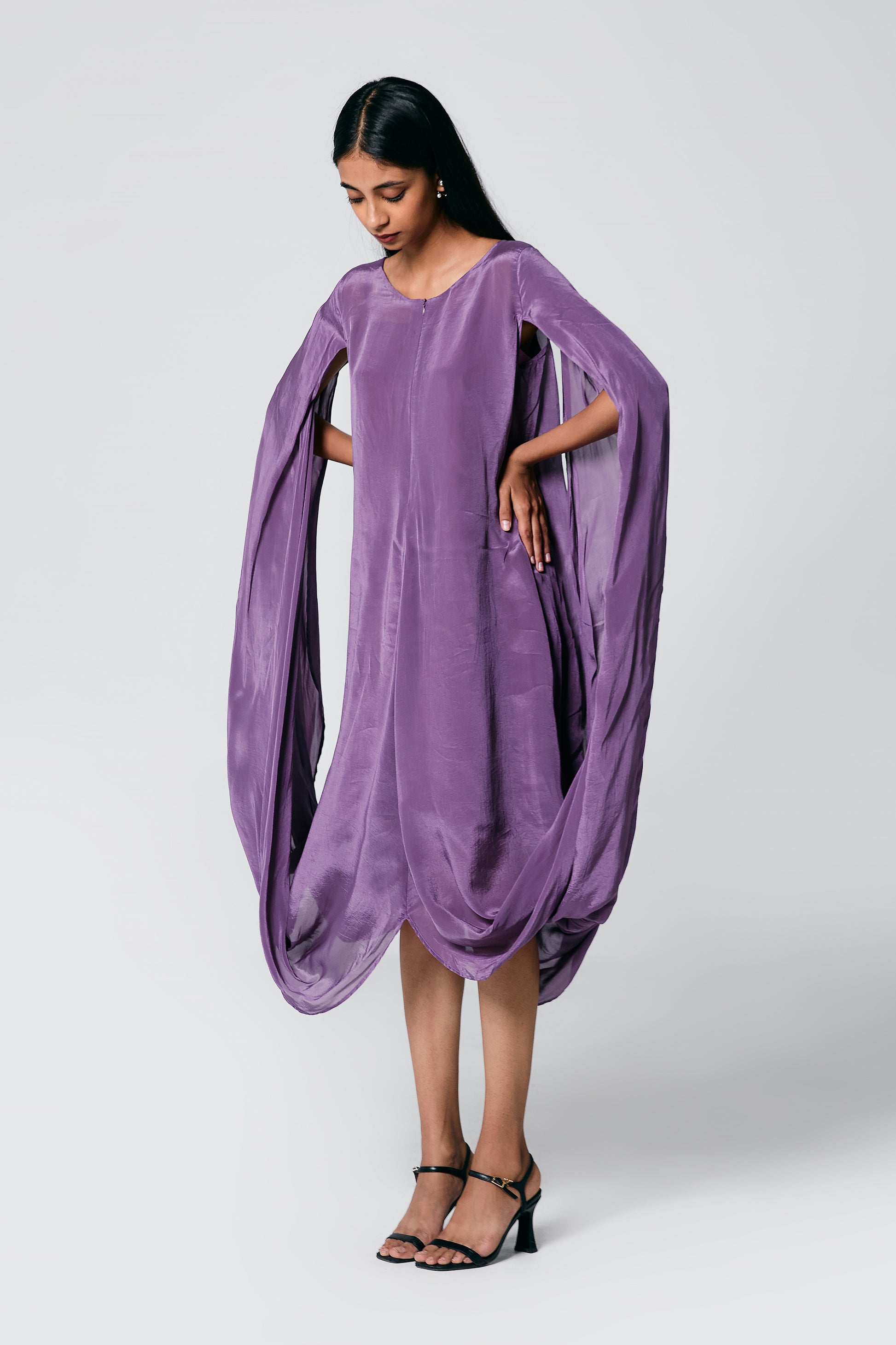 A statement-making draped dress that merges fluid form with bold silhouette. It features a relaxed fit with sculptural cowl details at the legs and dramatic cape-style sleeves that cascade effortlessly.