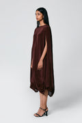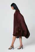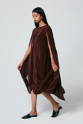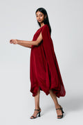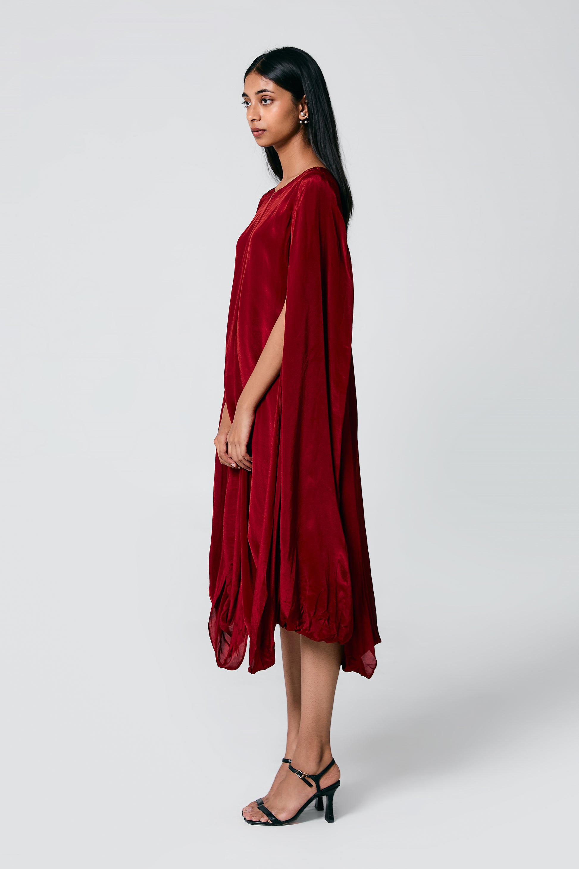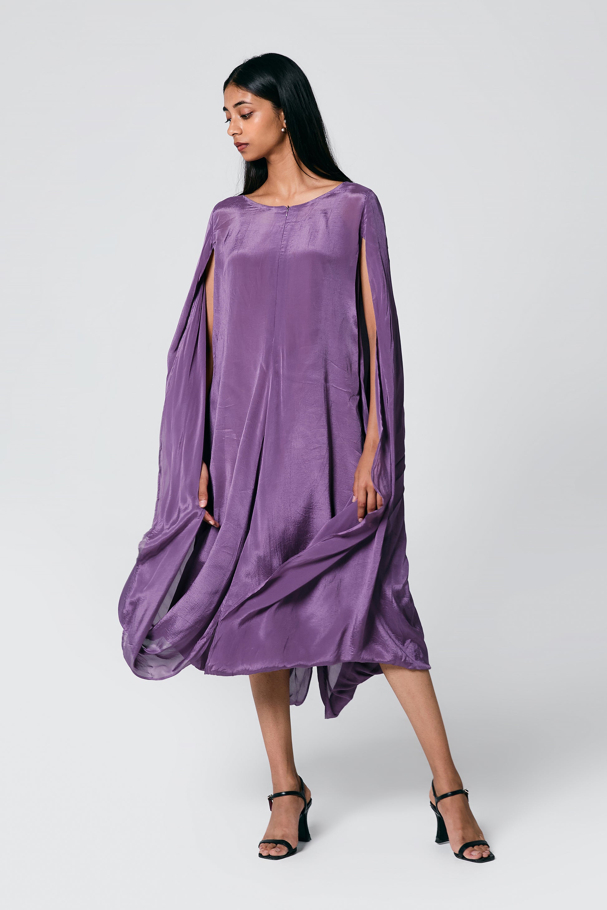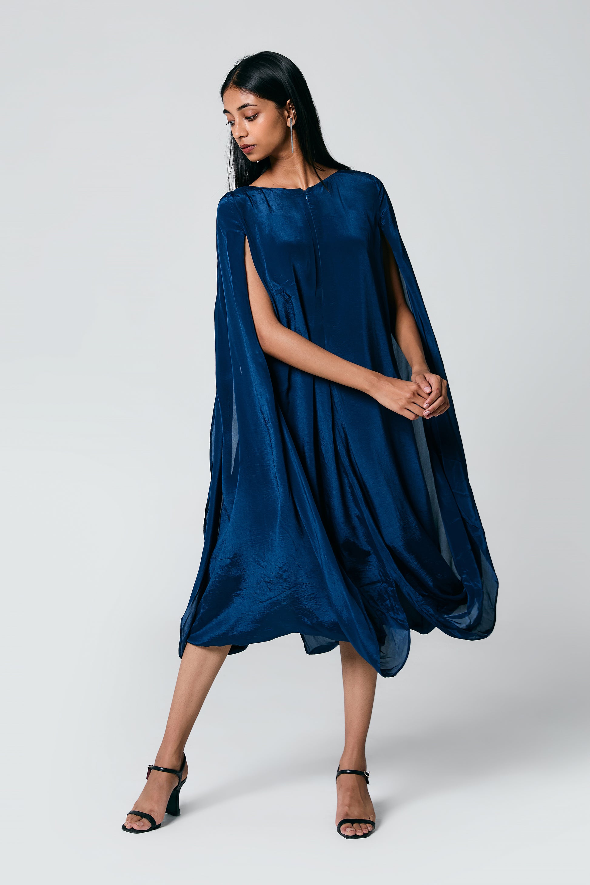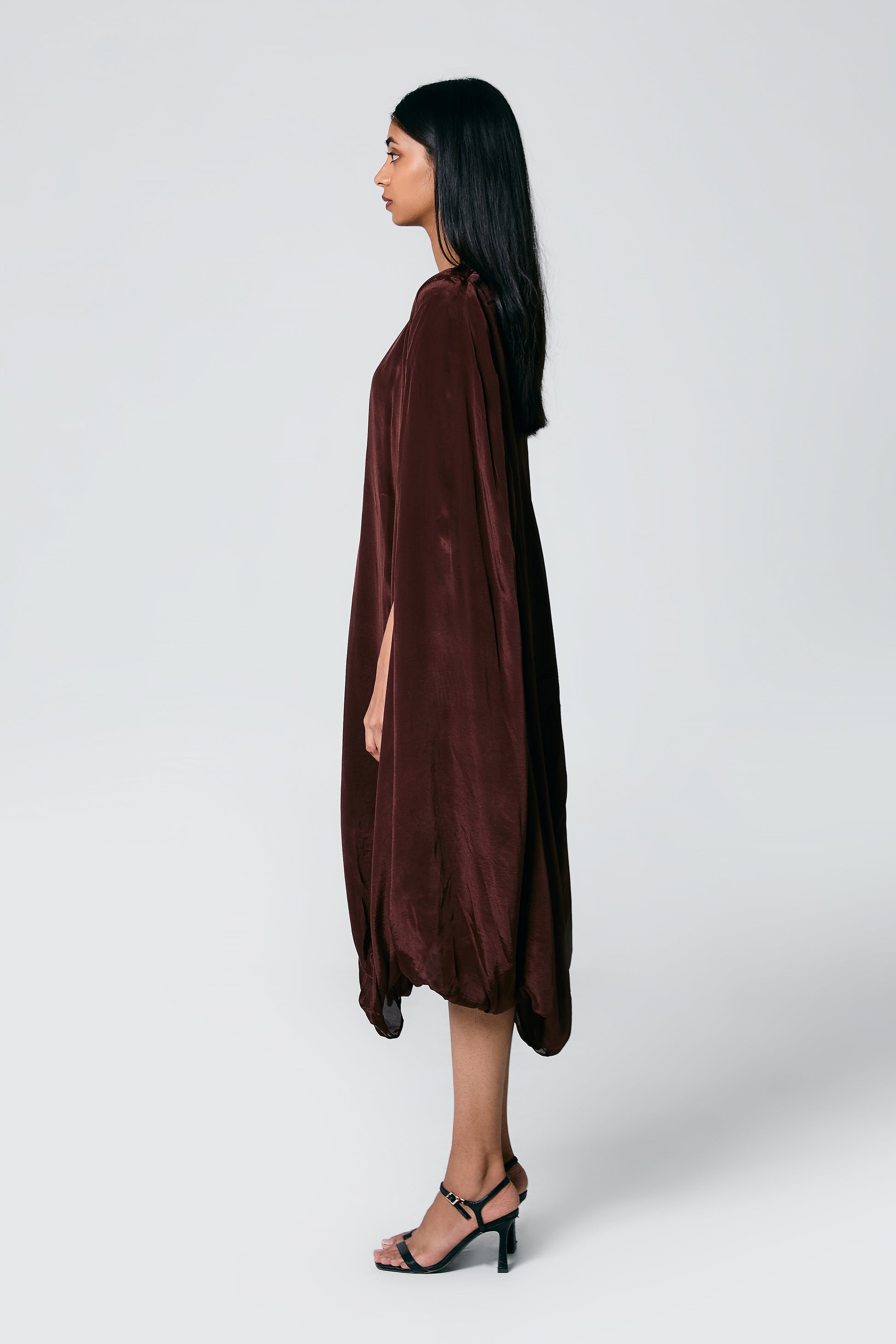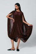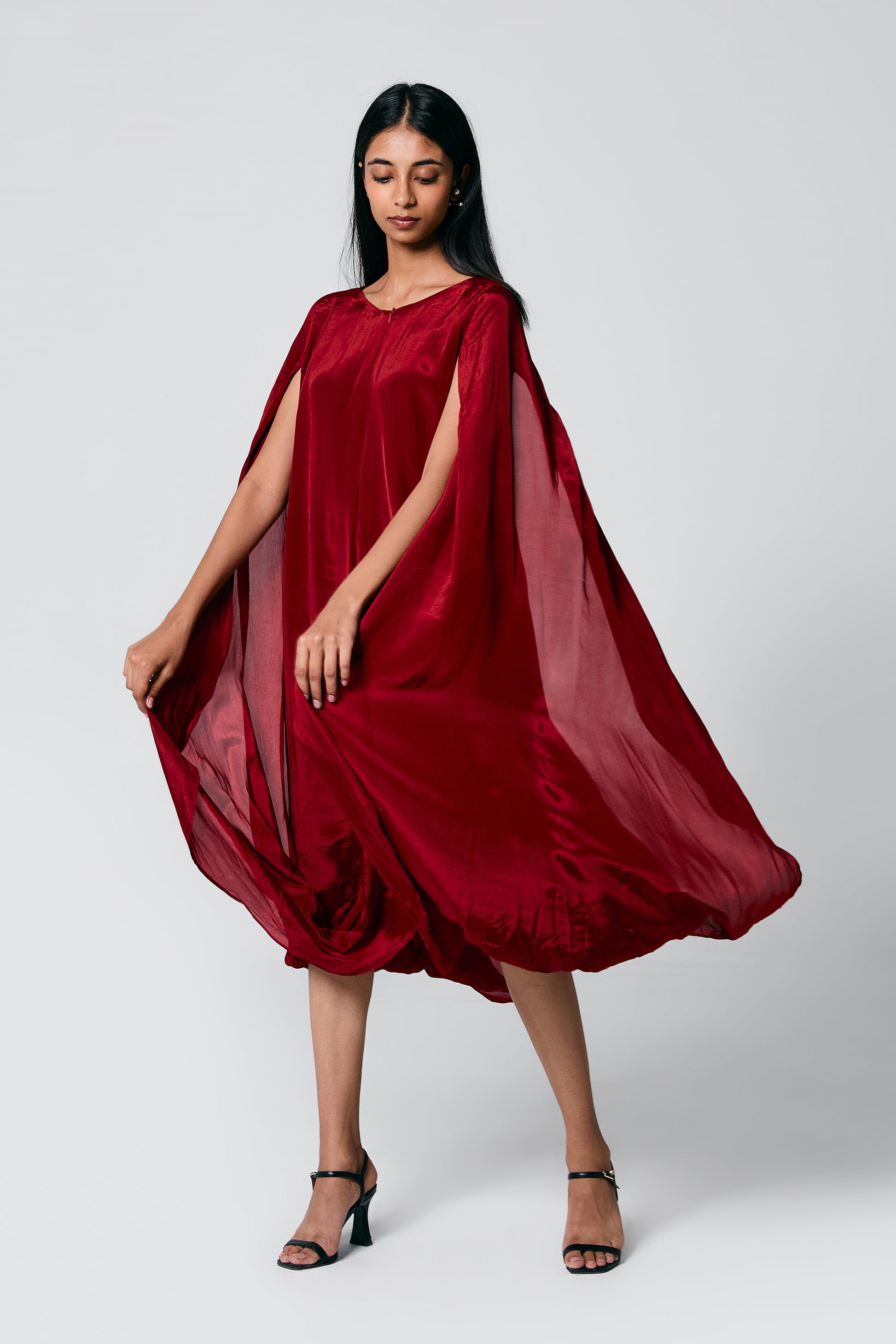 A statement-making draped dress that merges fluid form with bold silhouette. It features a relaxed fit with sculptural cowl details at the legs and dramatic cape-style sleeves that cascade effortlessly.