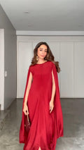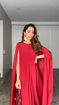 A statement-making draped dress that merges fluid form with bold silhouette. It features a relaxed fit with sculptural cowl details at the legs and dramatic cape-style sleeves that cascade effortlessly.