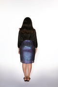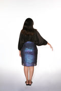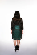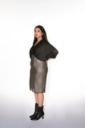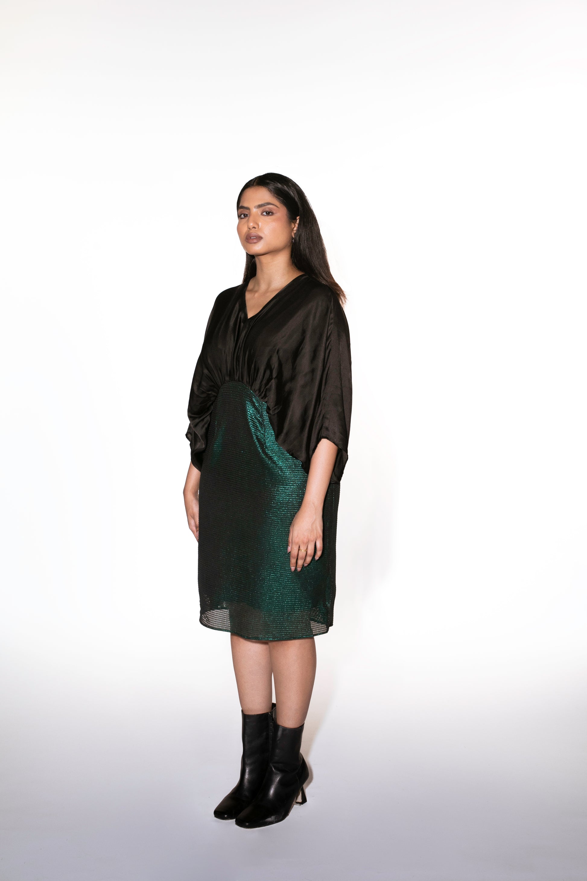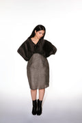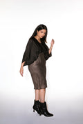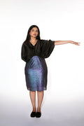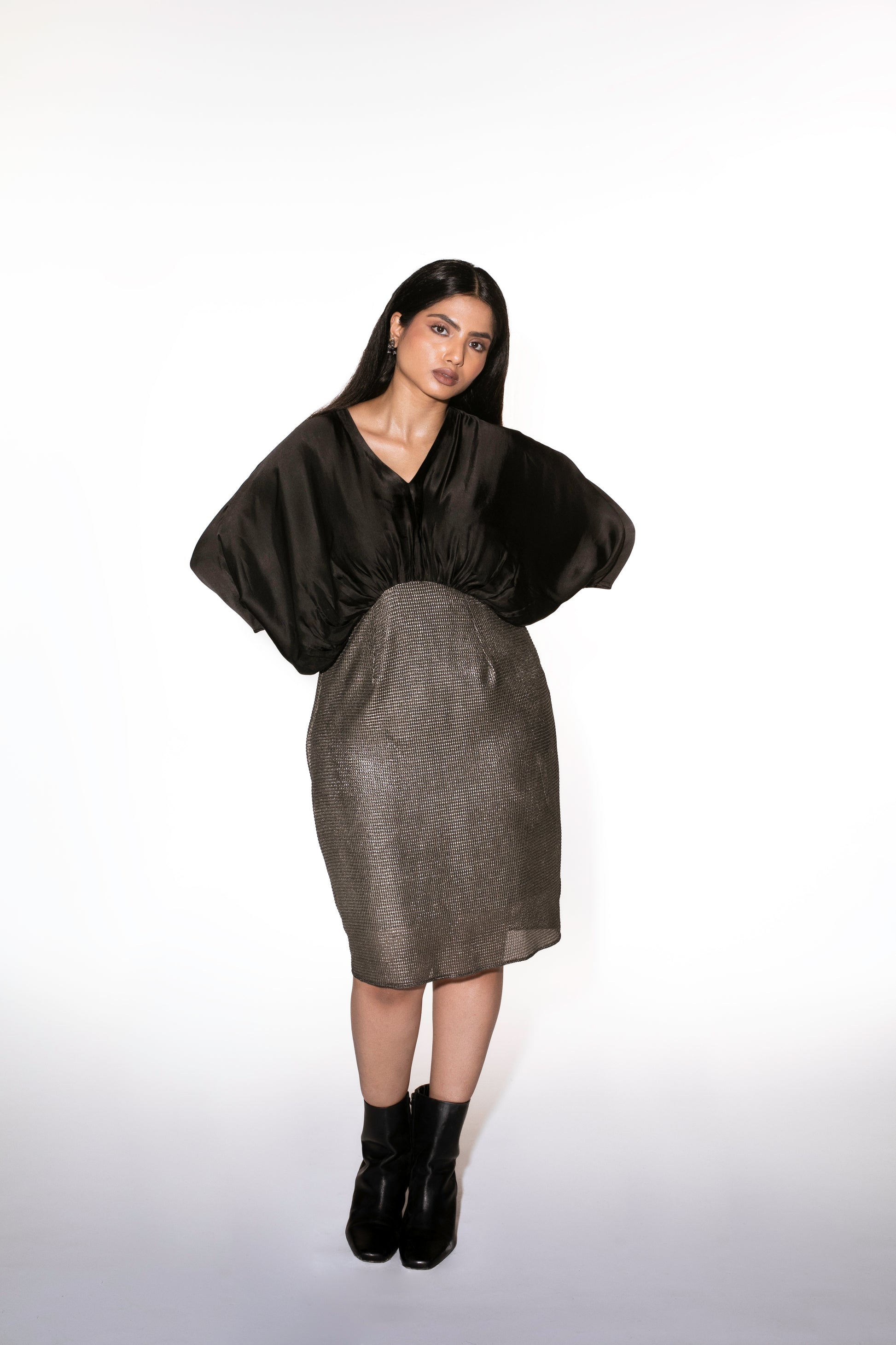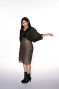 This dress features a gathered top with sleeves that drop to the elbow length. The straight-fit bottom creates a sleek silhouette, while the metallic fabric adds a touch of modern glamour. This dress combines classic style with a contemporary touch.