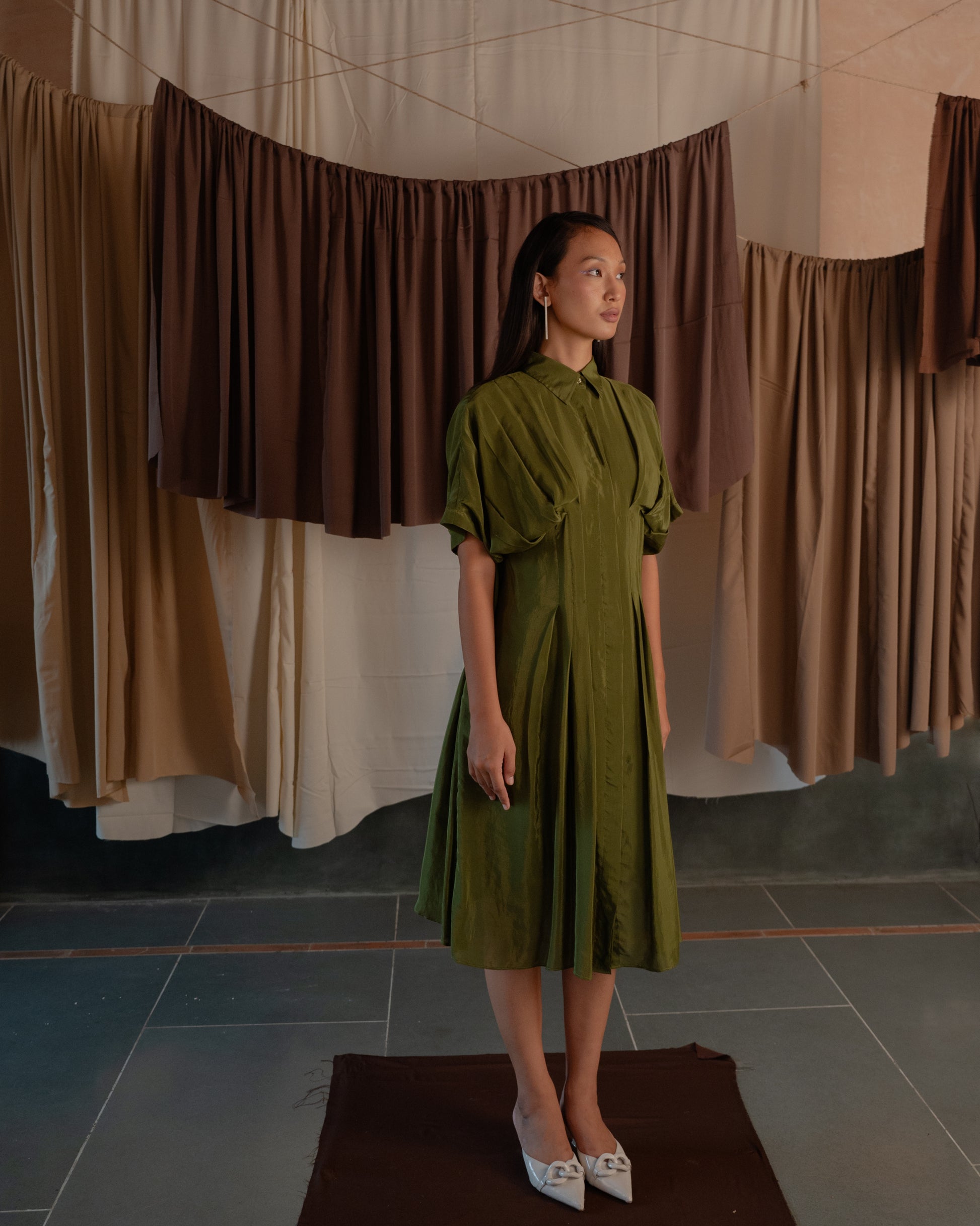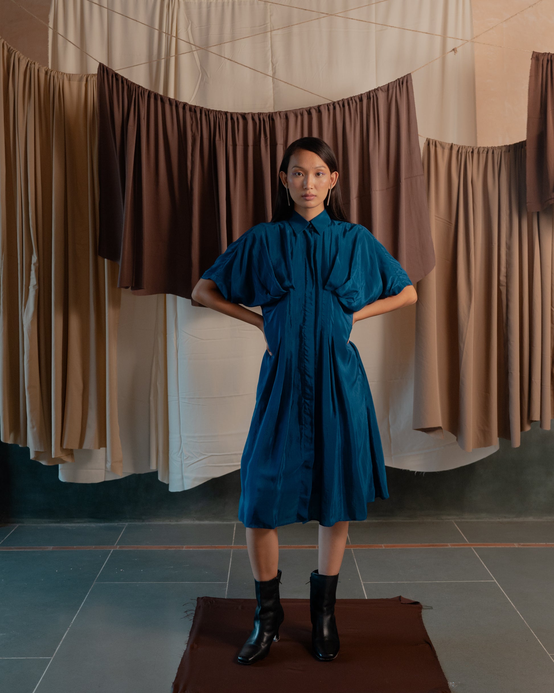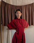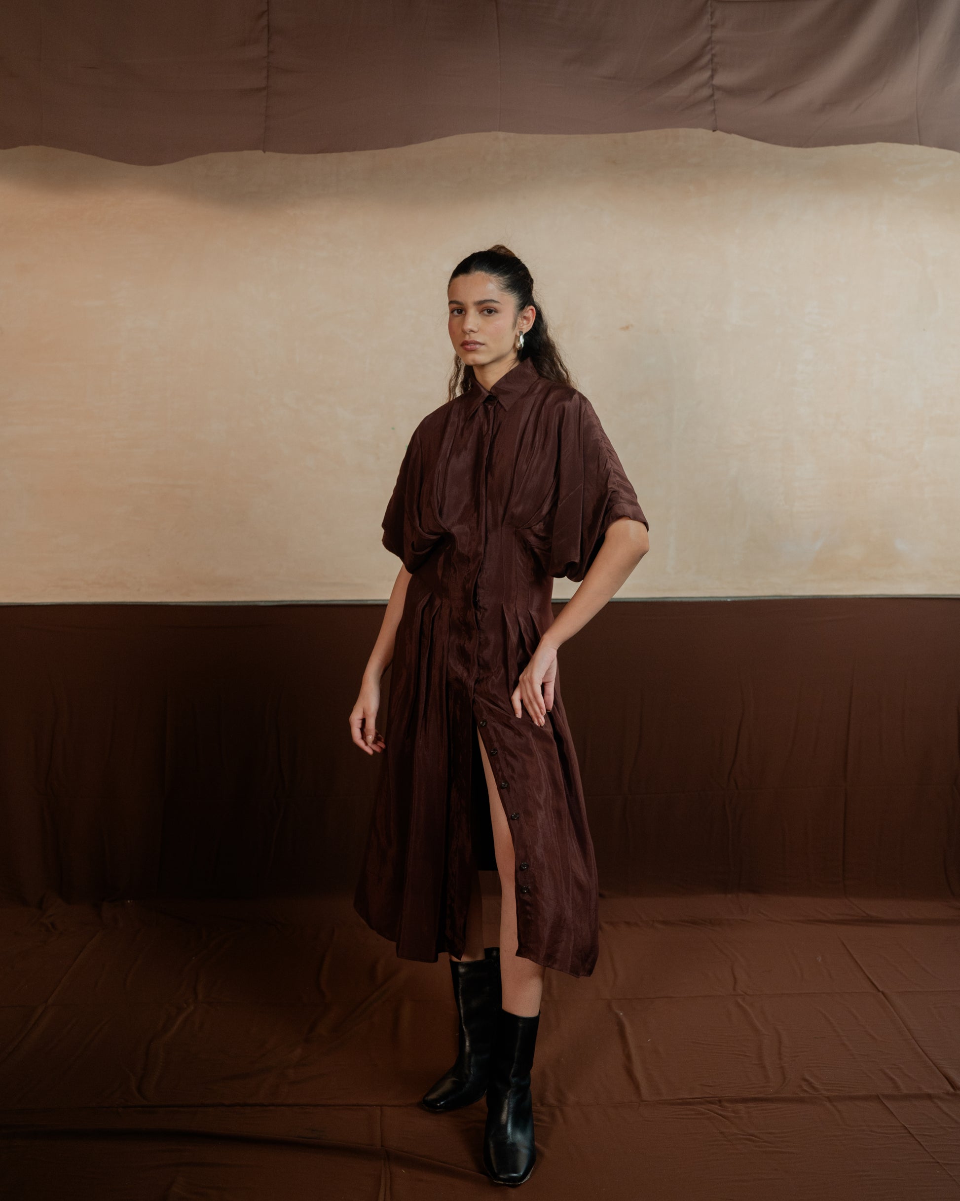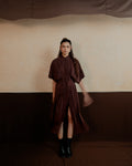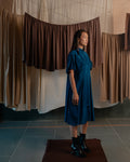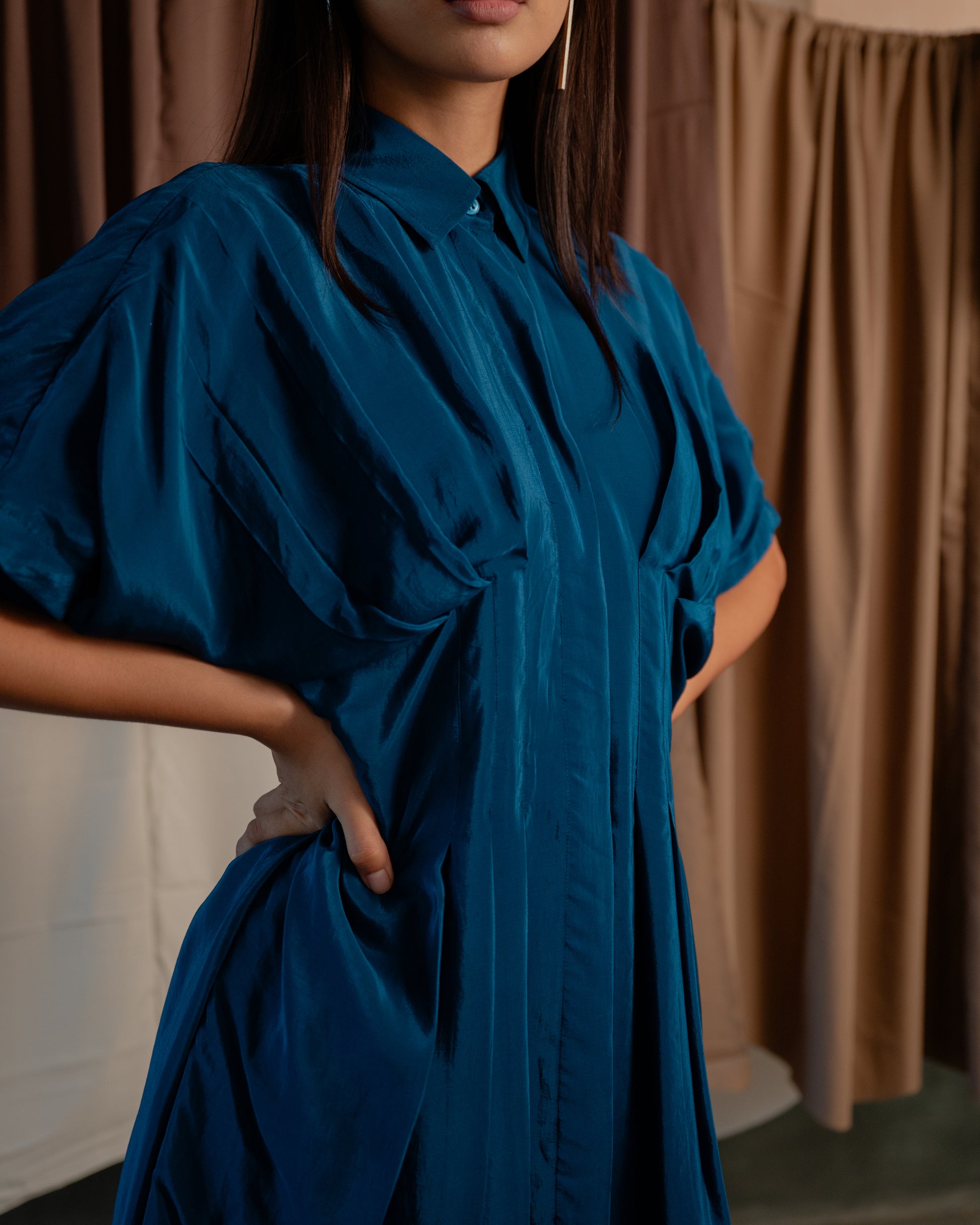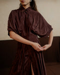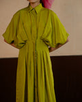 This mid length shirt dress has a cinched and pleated waist. The pleating accentuates your figure, adding a flattering flair to both the upper and lower body. Its sleek design makes it ideal for any occasion, effortlessly transitioning from a chic daytime look to an elegant evening outfit.