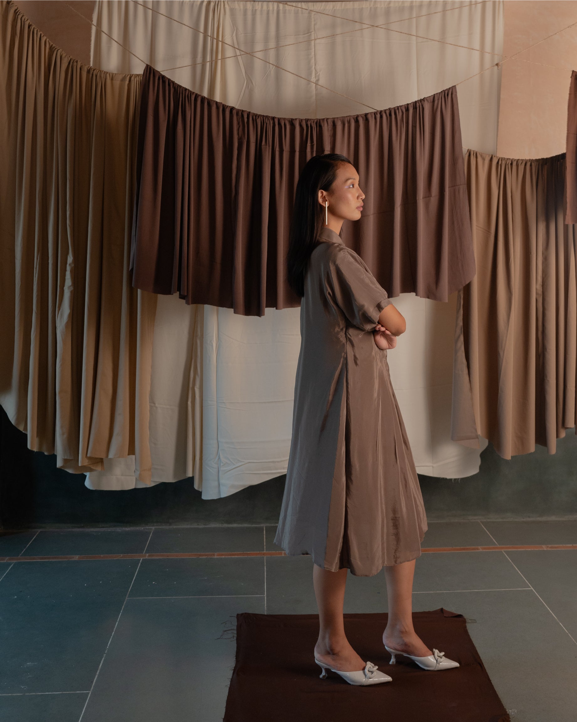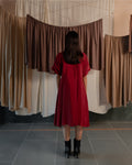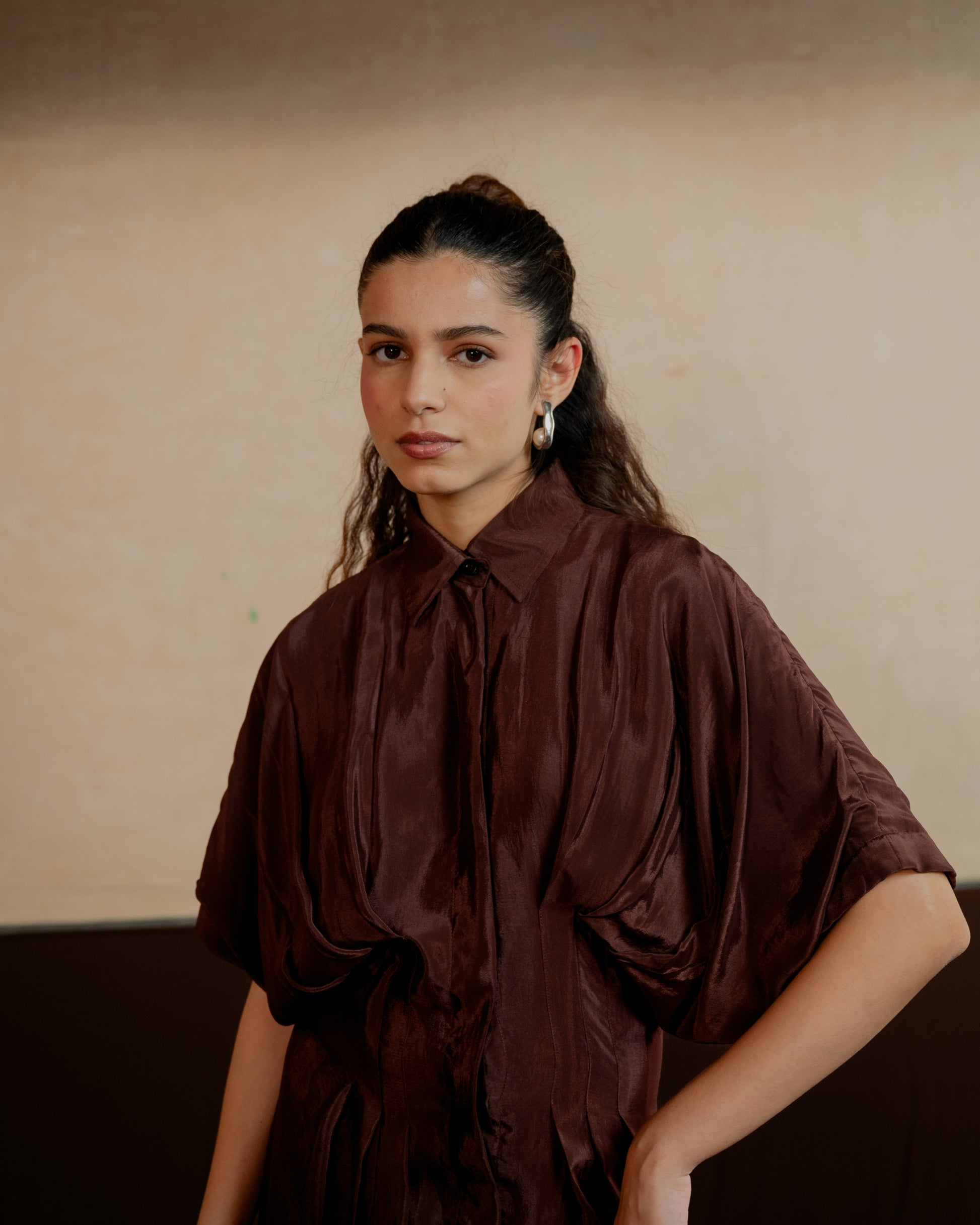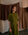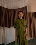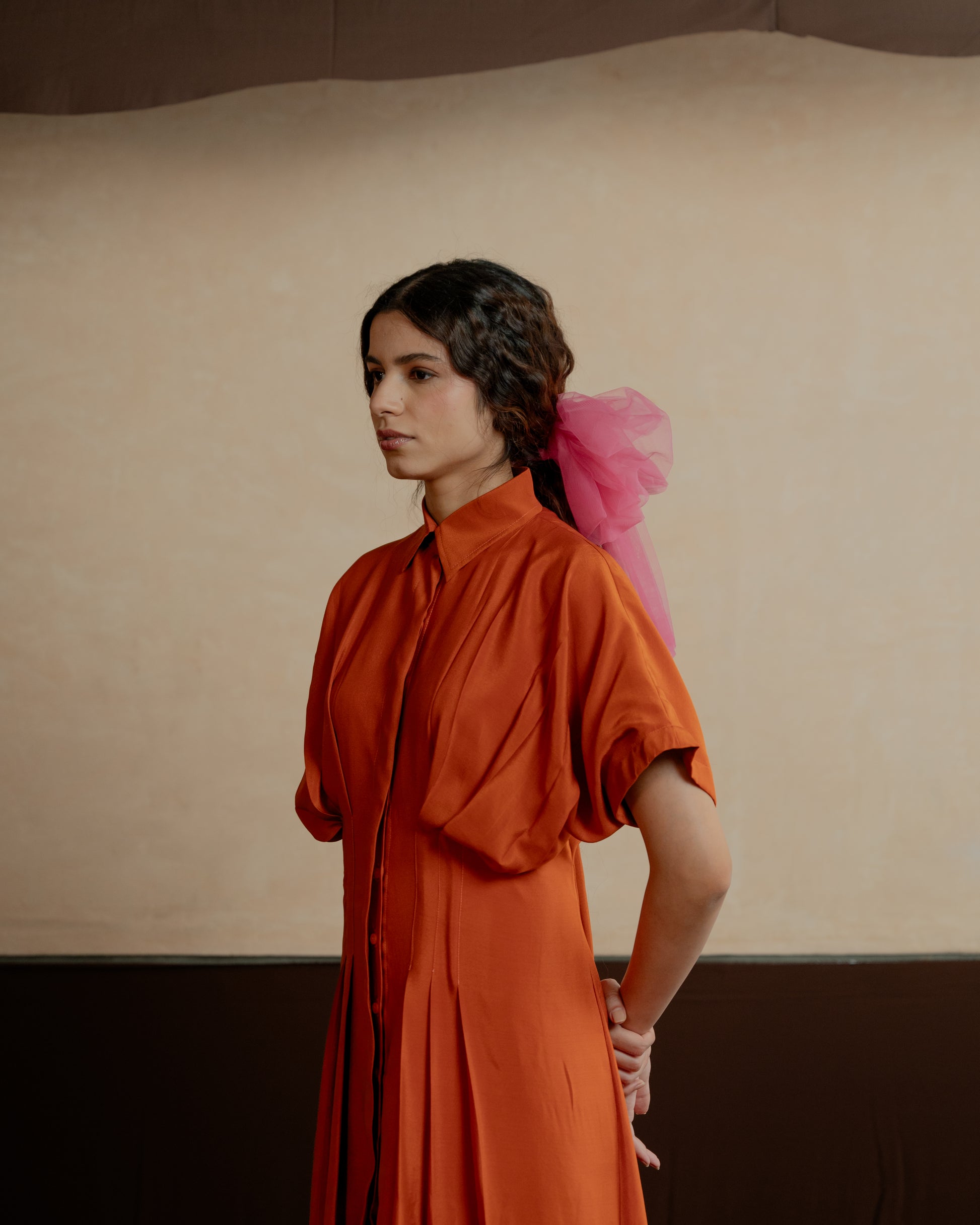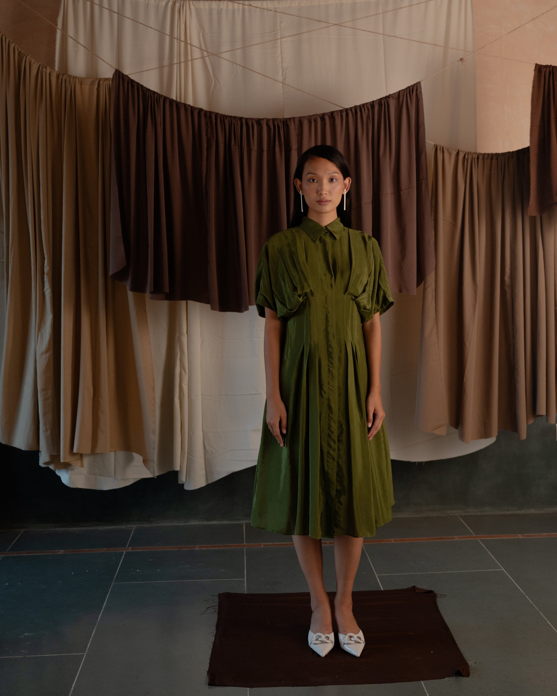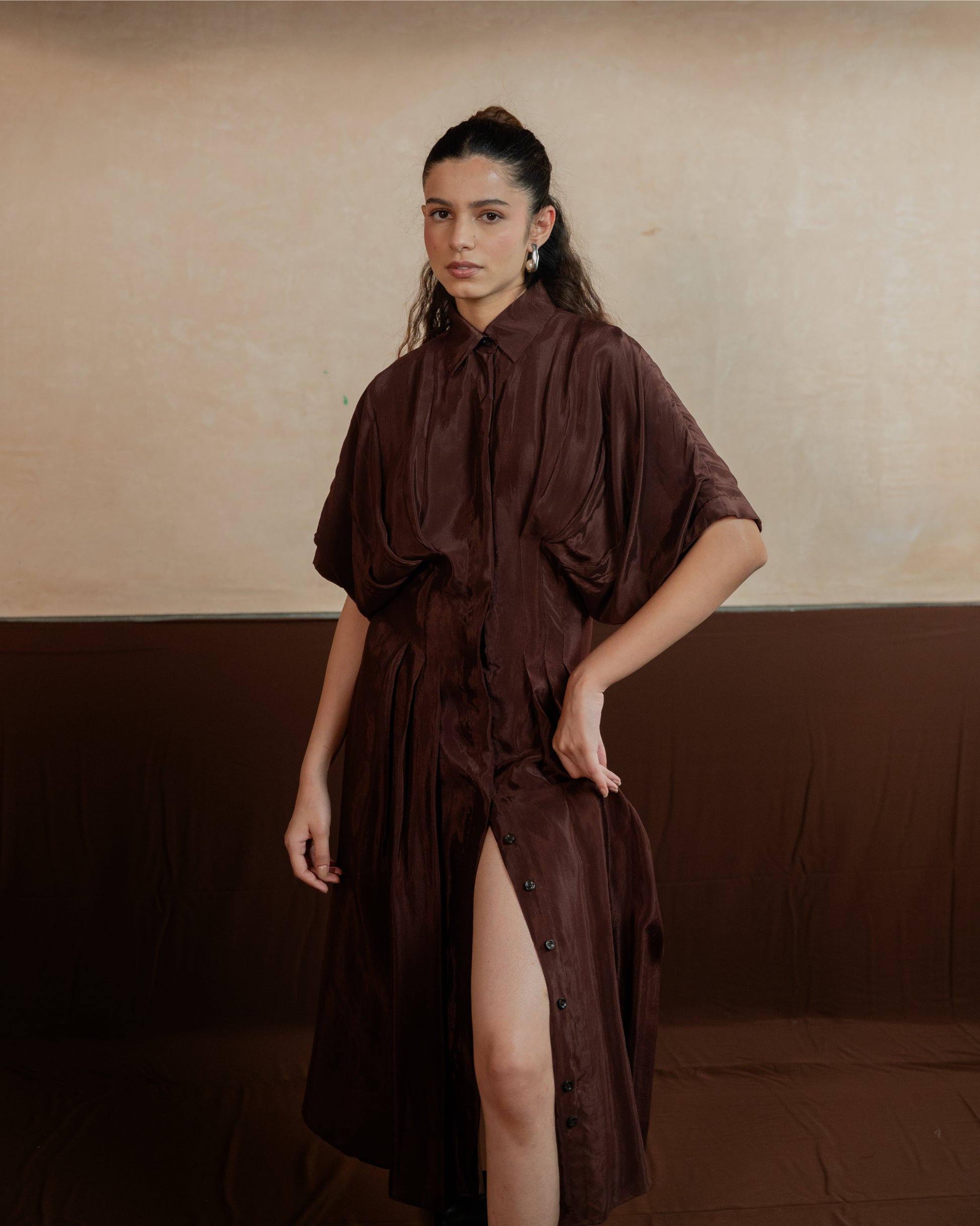 This mid length shirt dress has a cinched and pleated waist. The pleating accentuates your figure, adding a flattering flair to both the upper and lower body. Its sleek design makes it ideal for any occasion, effortlessly transitioning from a chic daytime look to an elegant evening outfit.