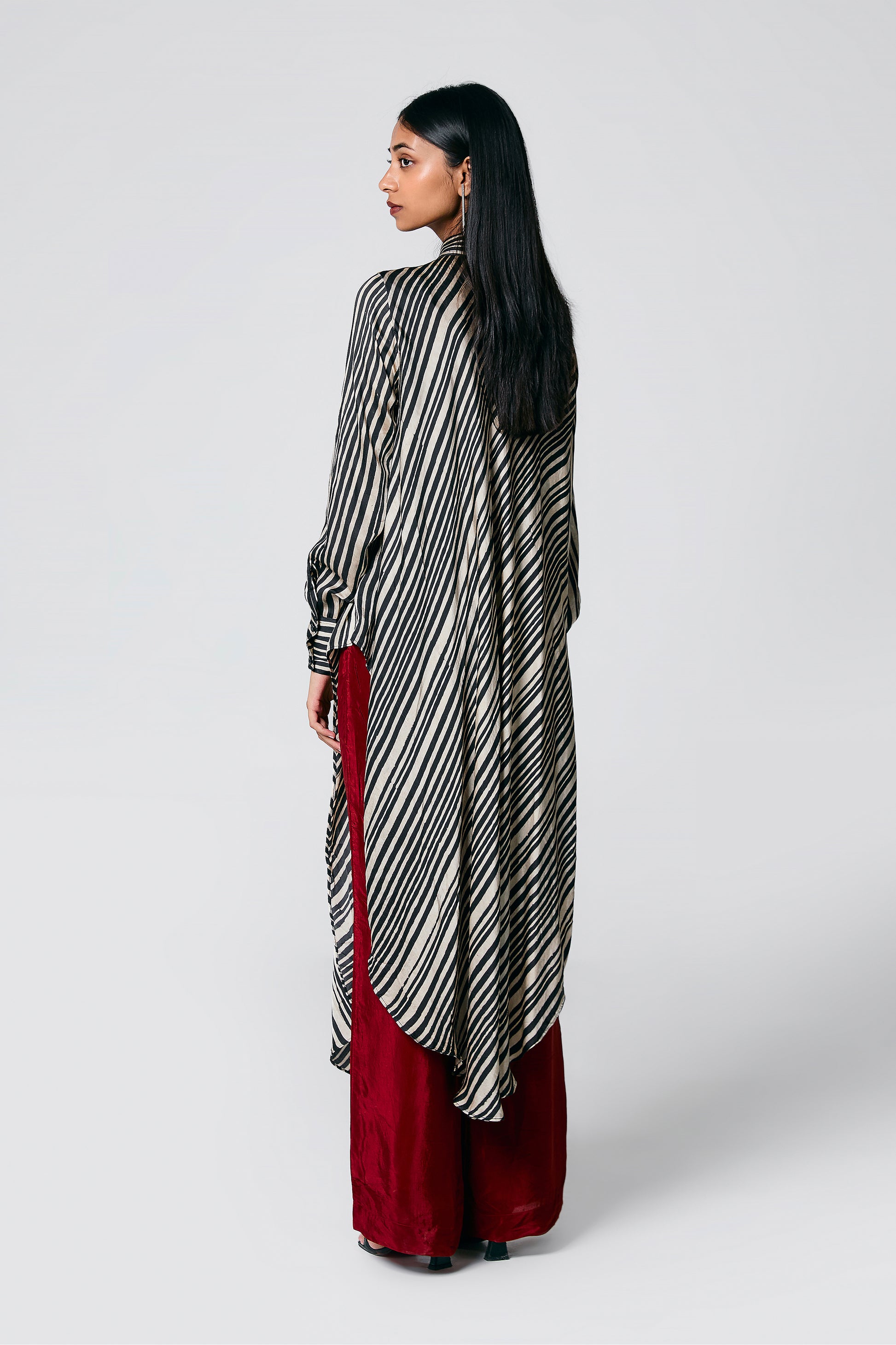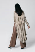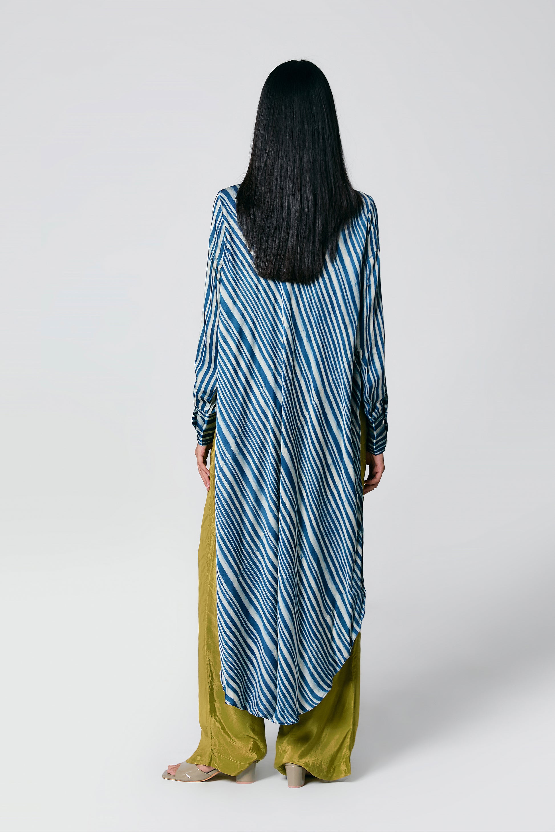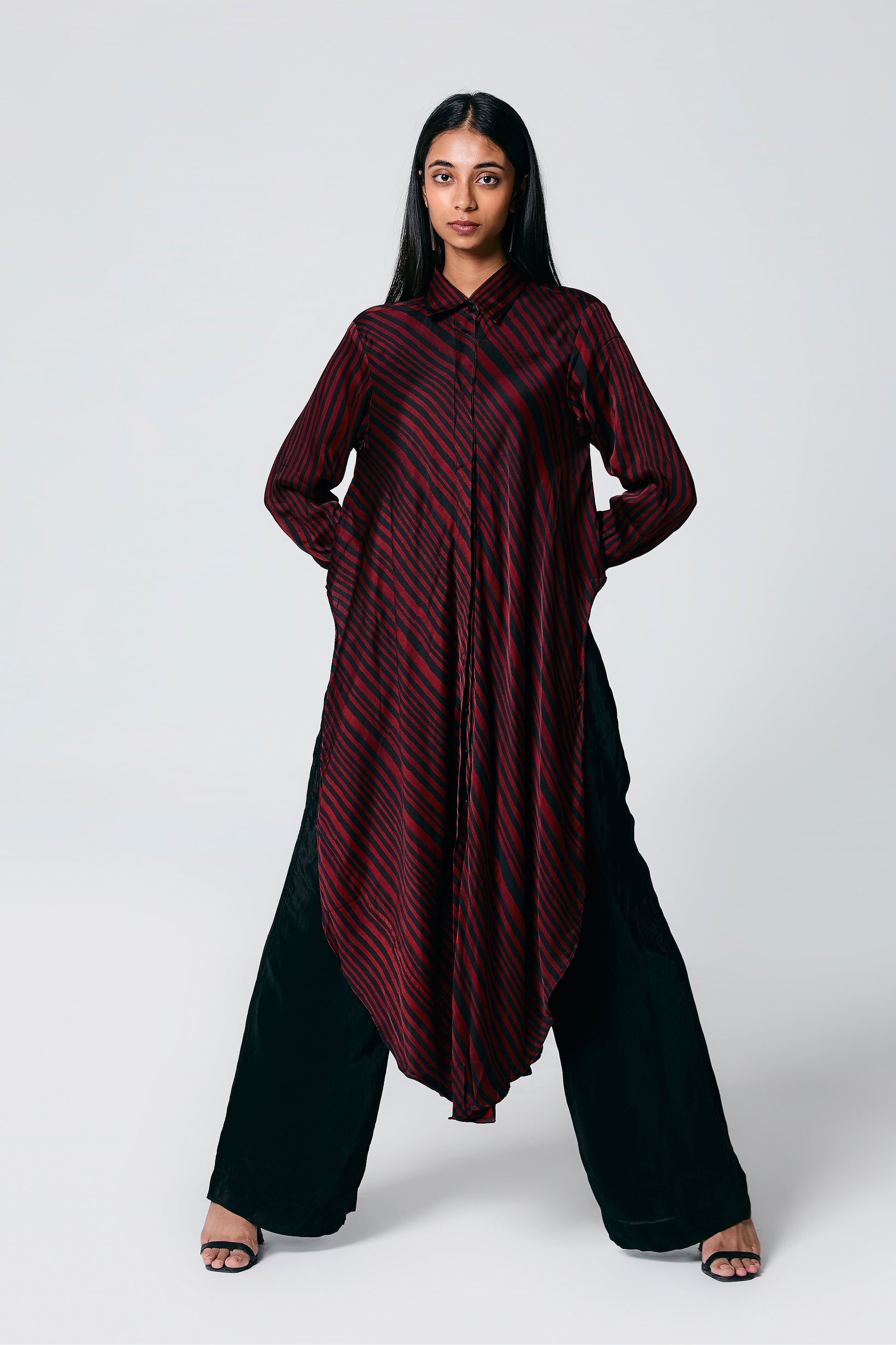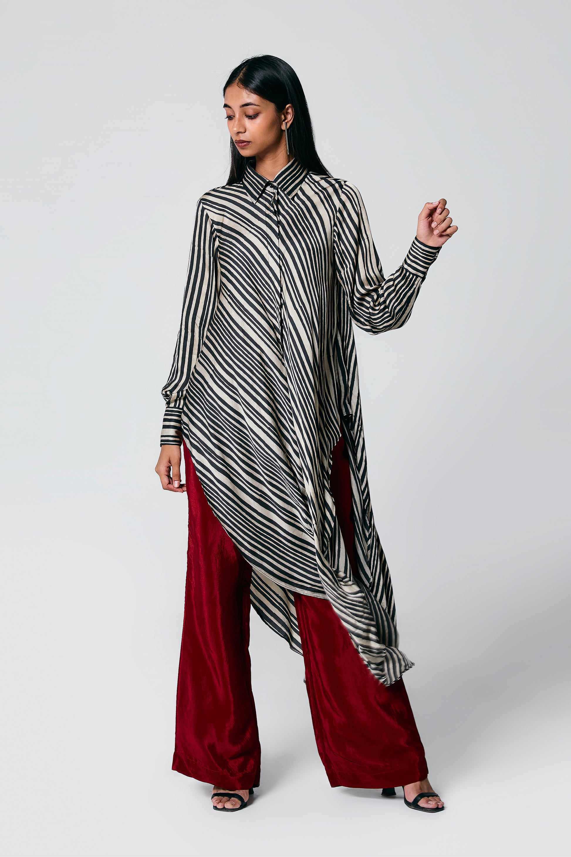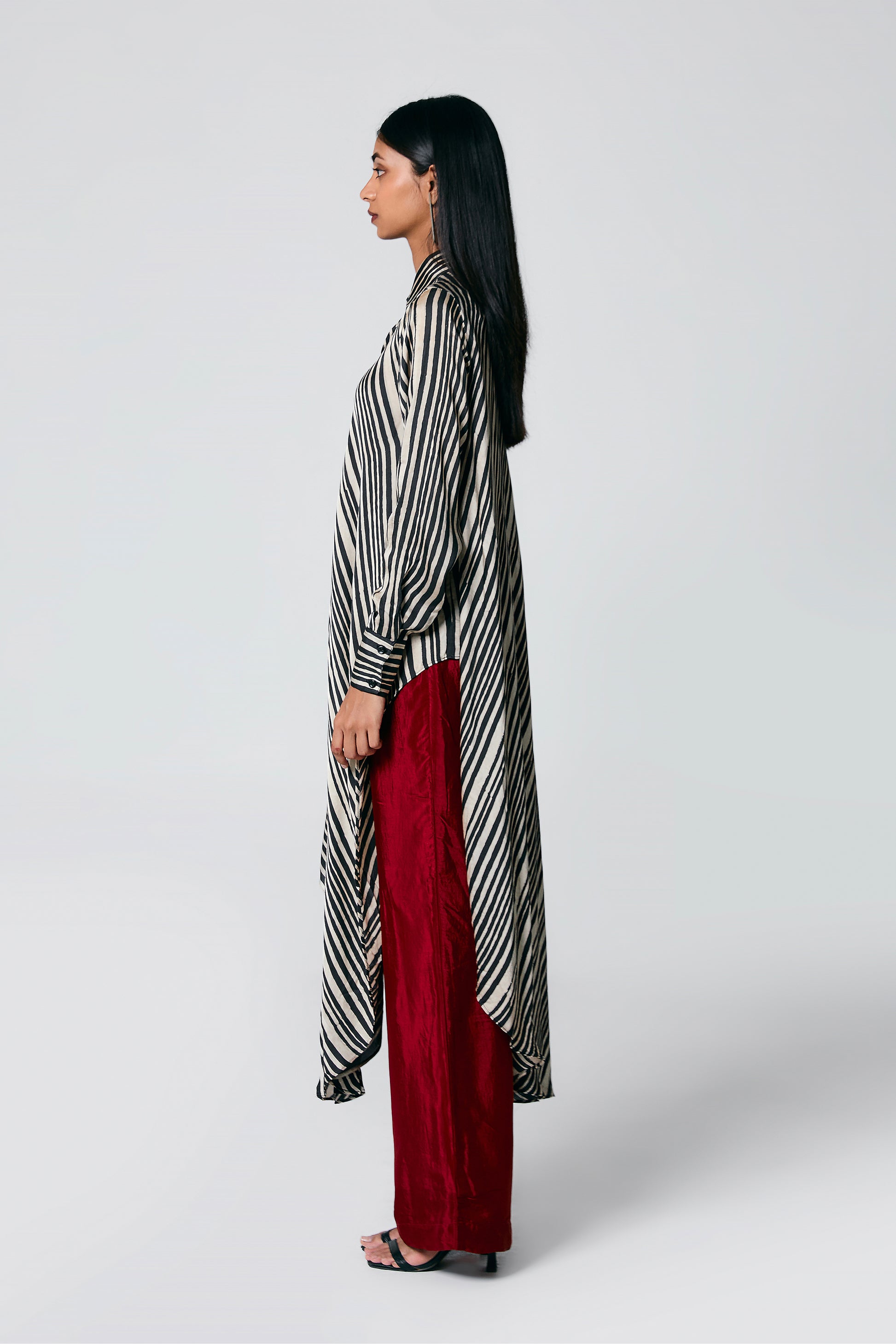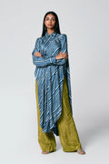 A modern silhouette with a handcrafted soul — this co-ord set features a striped Ajrakh hand block printed shirt, designed with a long front and low-cut sides for added movement. Paired with solid-coloured pants that subtly peek through, it’s a statement in contrast, comfort, and quiet drama.