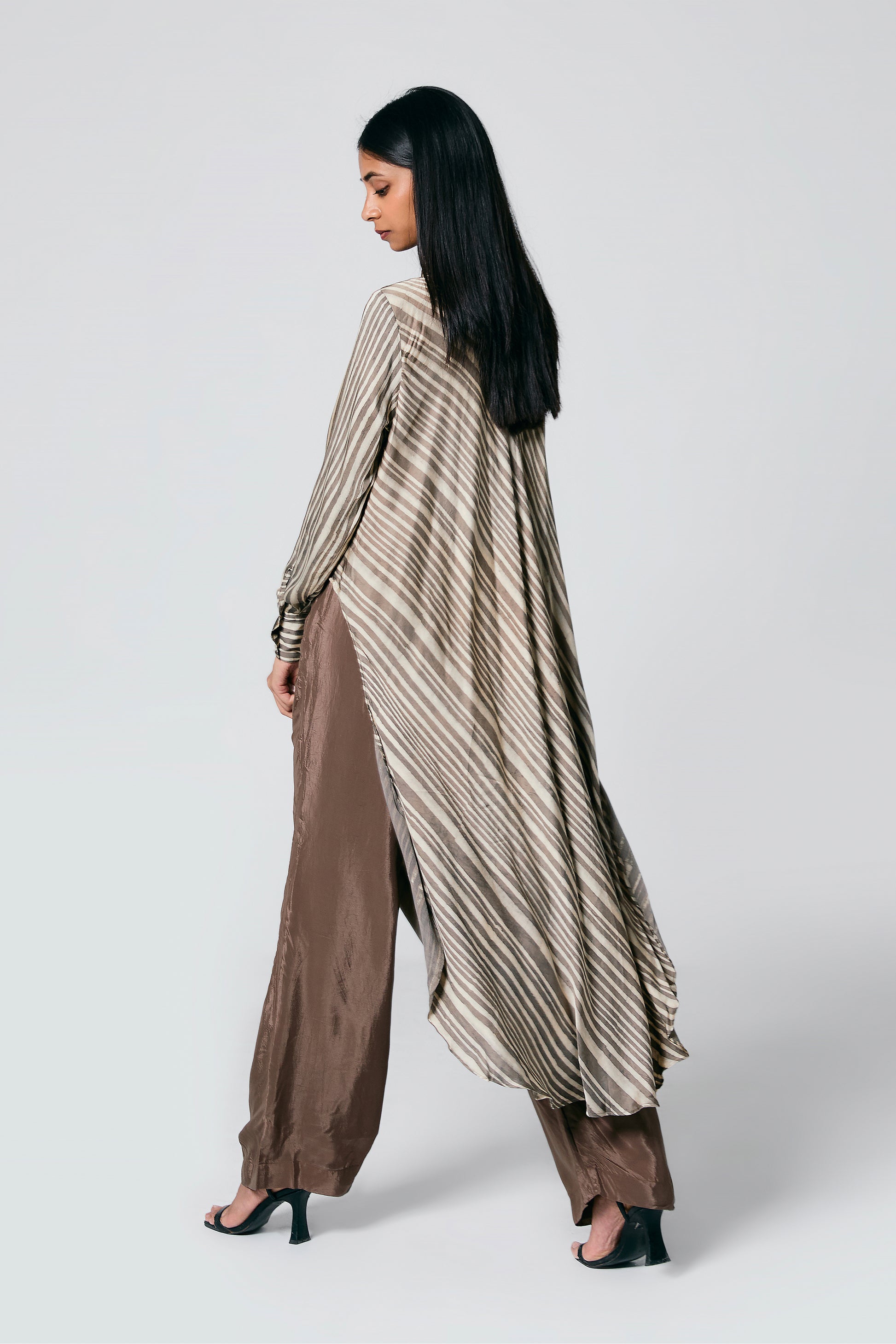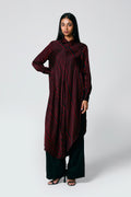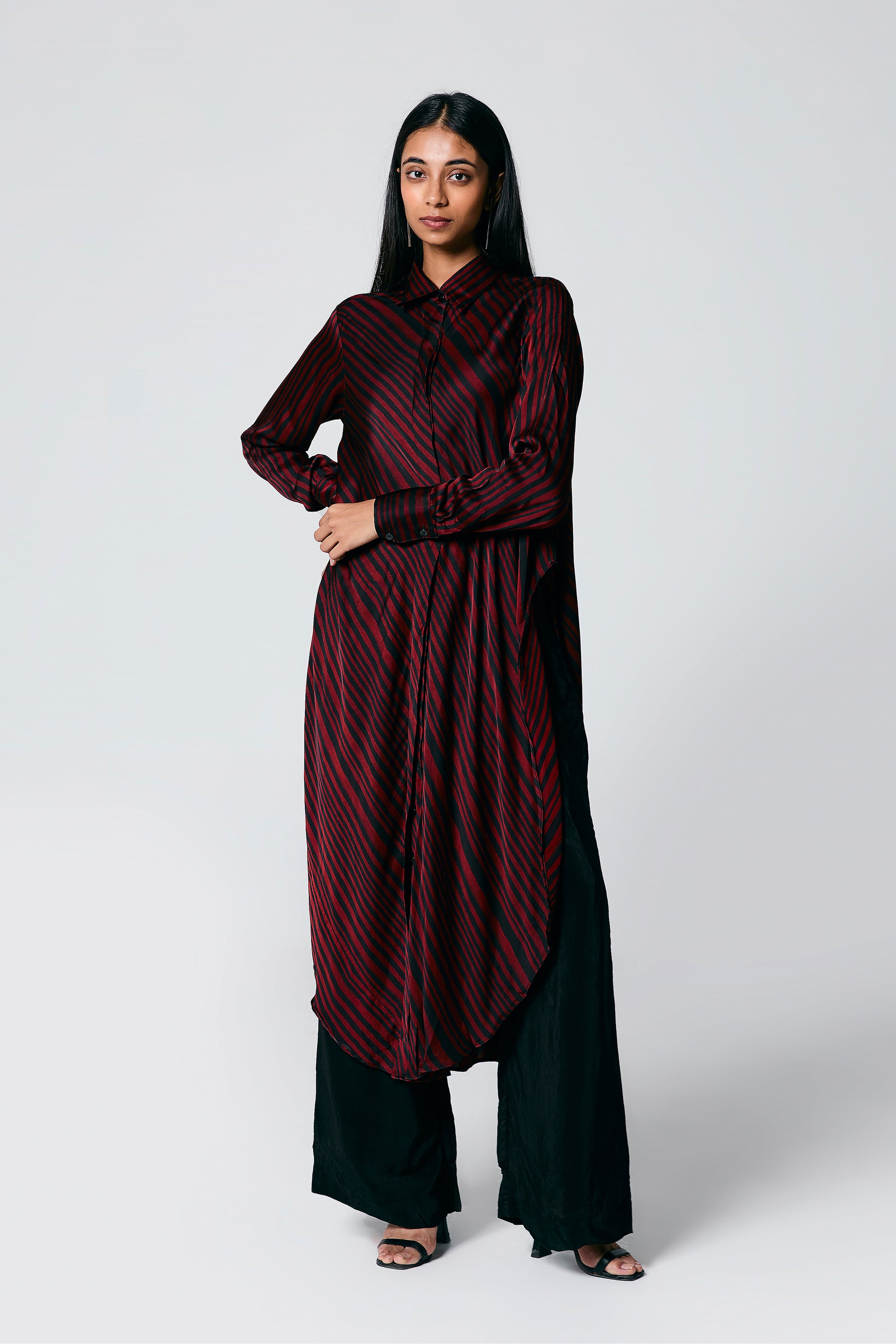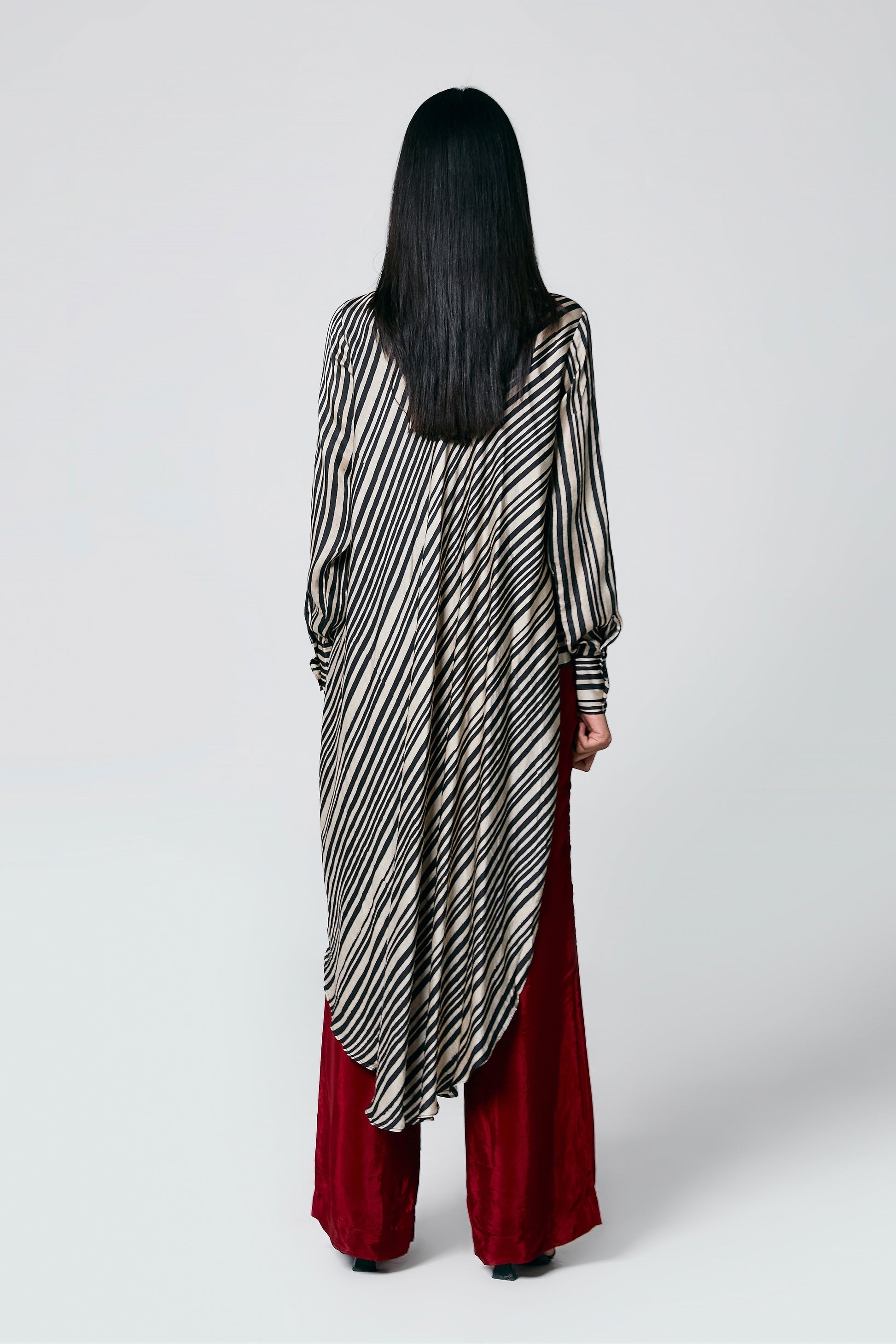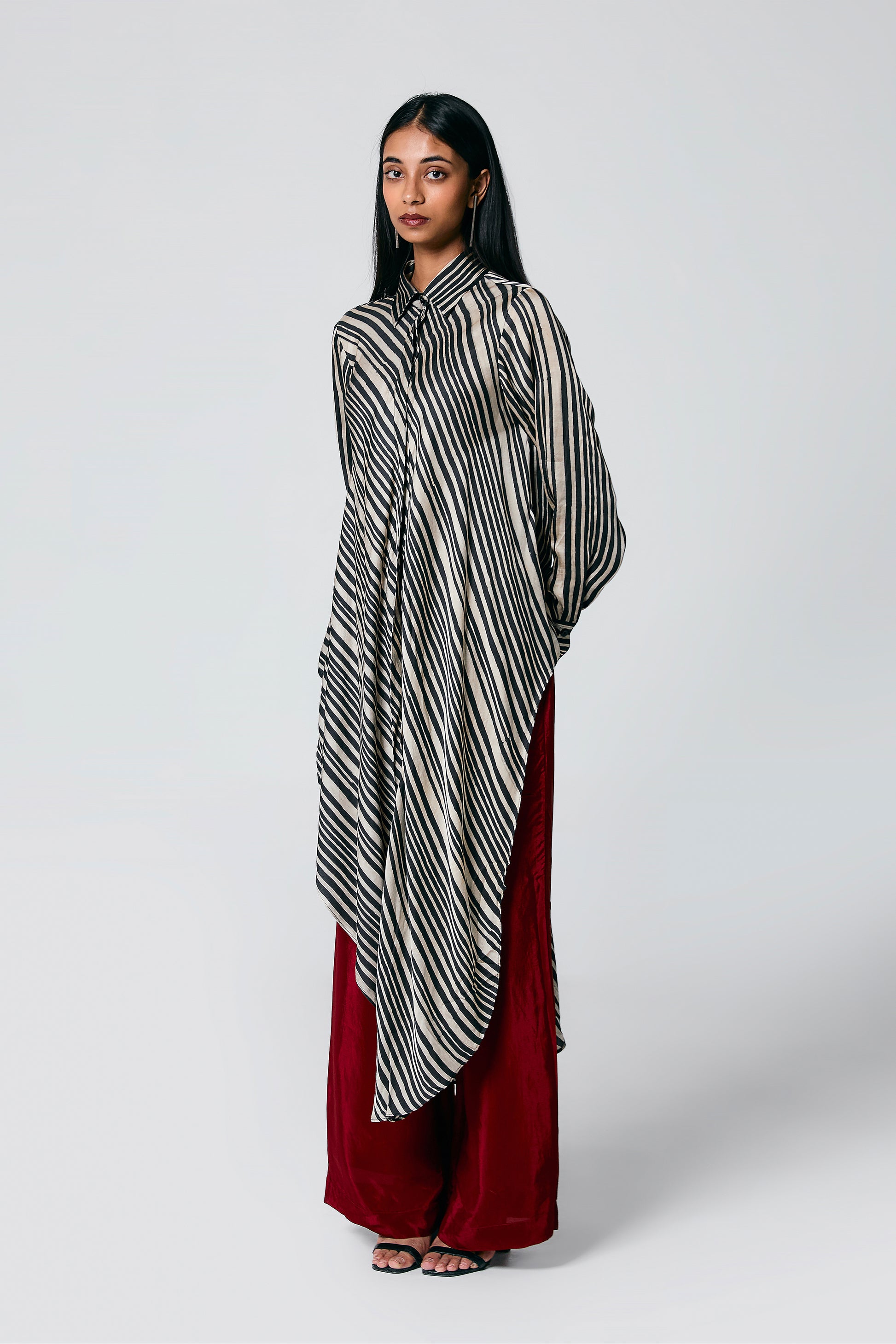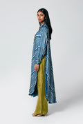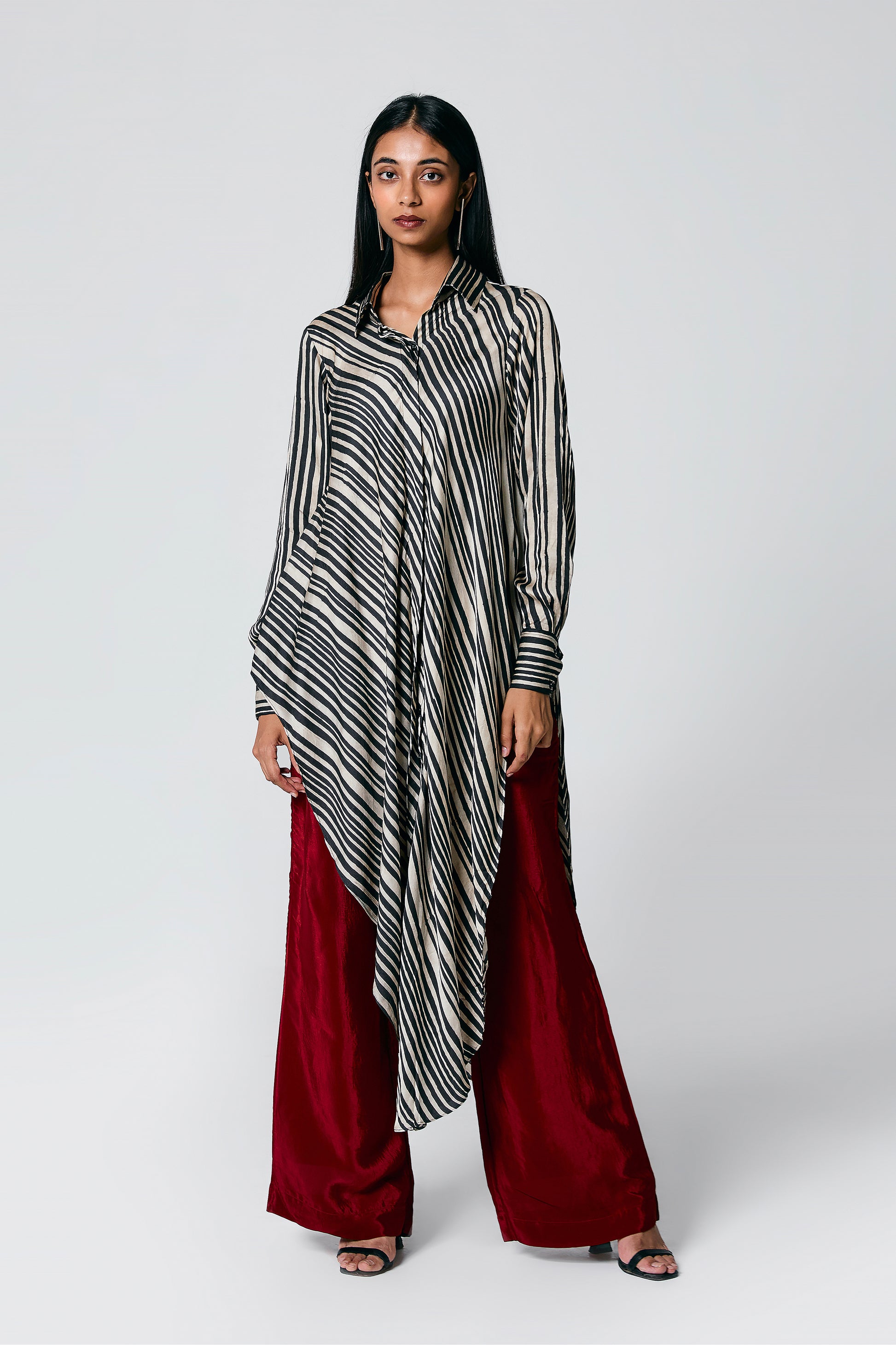 A modern silhouette with a handcrafted soul — this co-ord set features a striped Ajrakh hand block printed shirt, designed with a long front and low-cut sides for added movement. Paired with solid-coloured pants that subtly peek through, it’s a statement in contrast, comfort, and quiet drama.