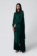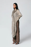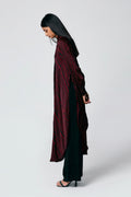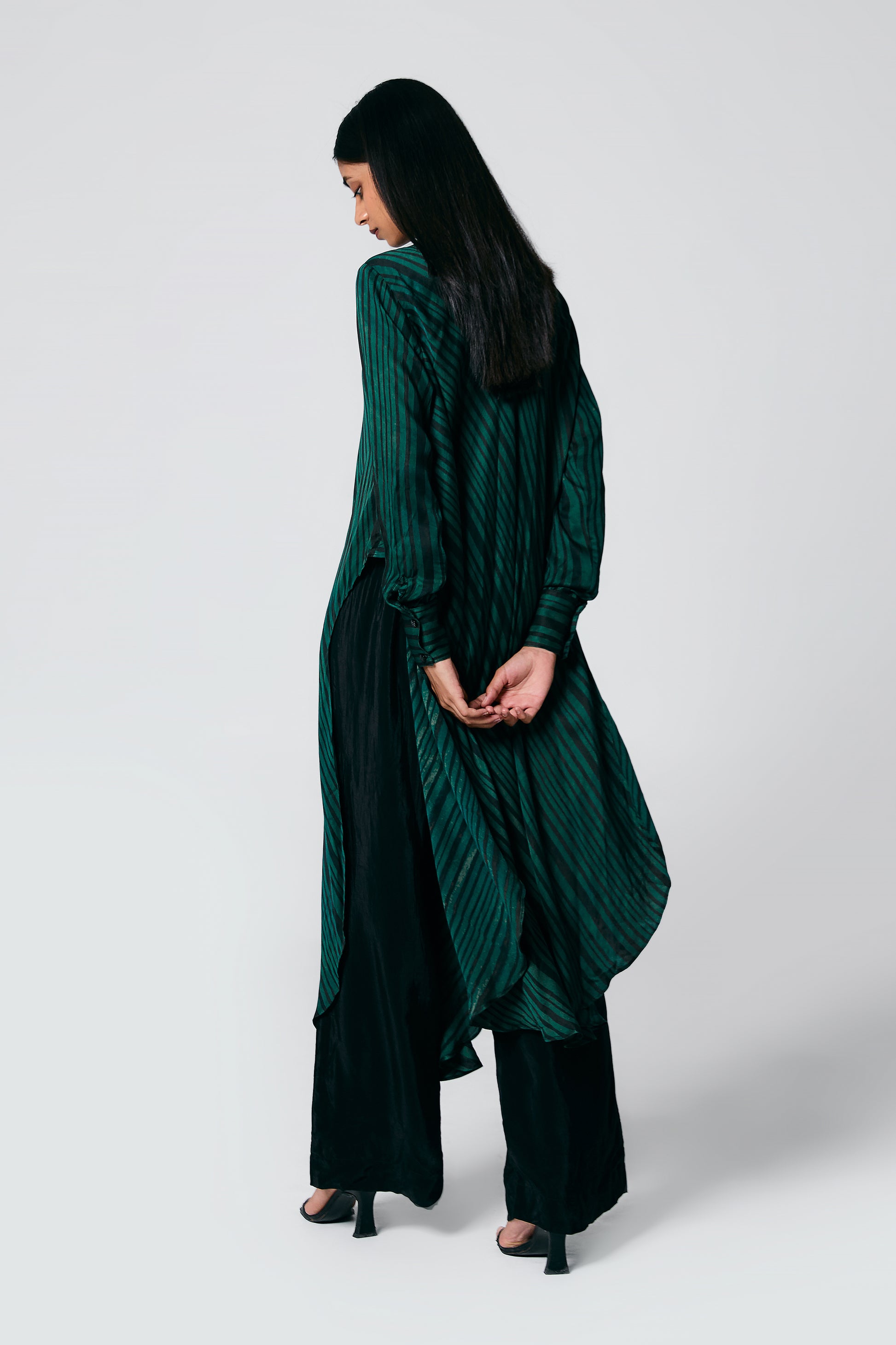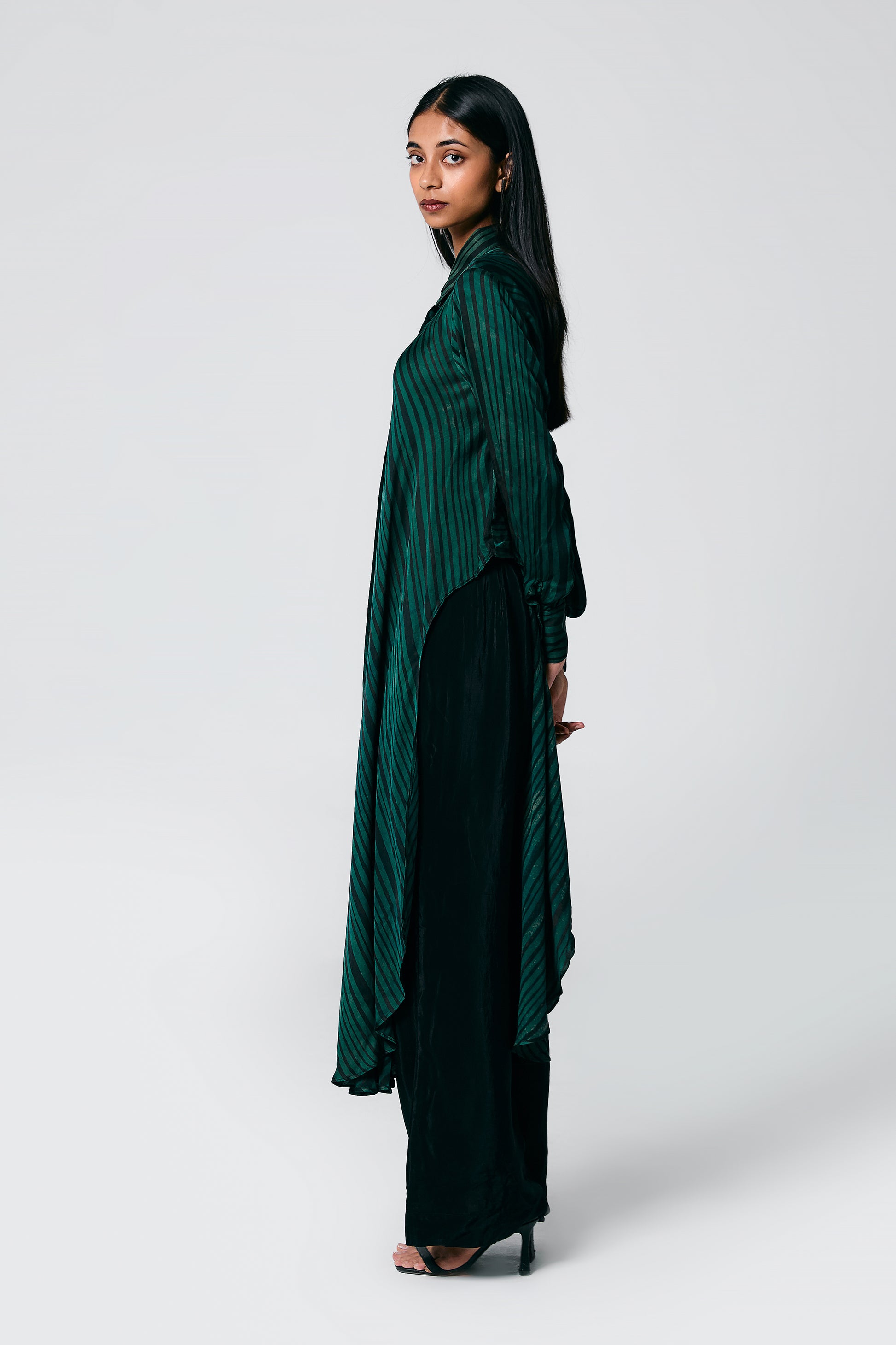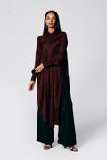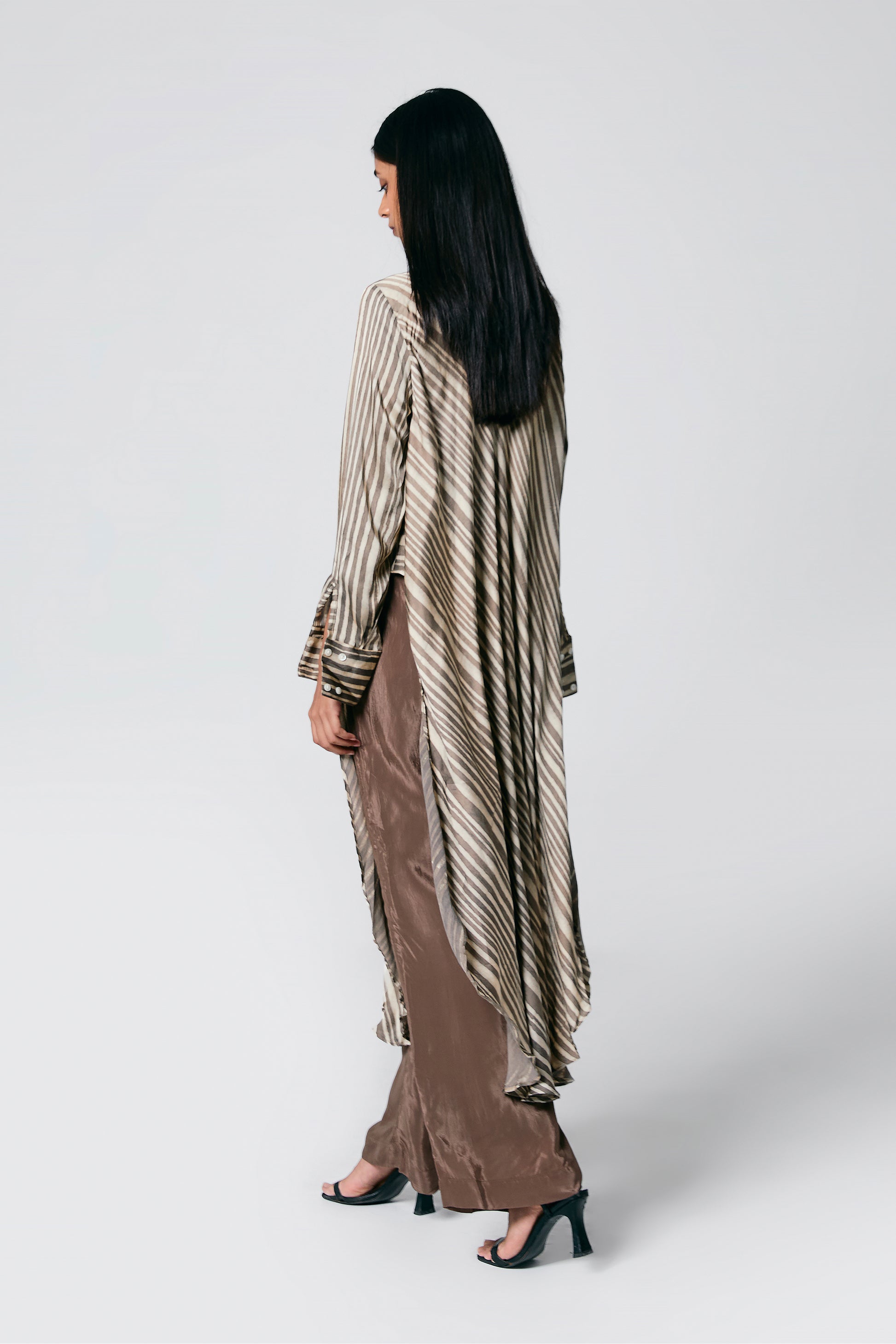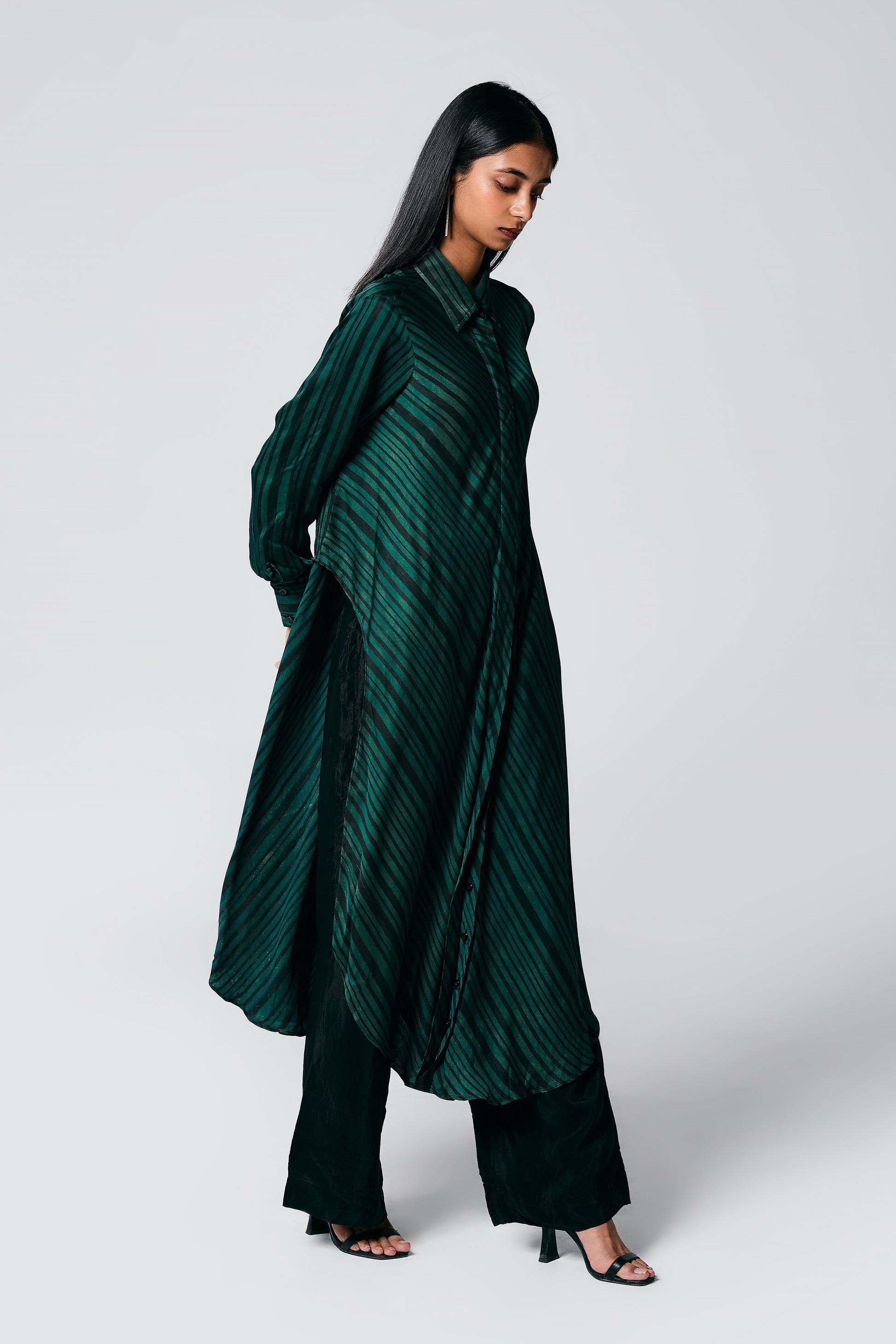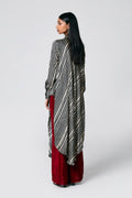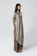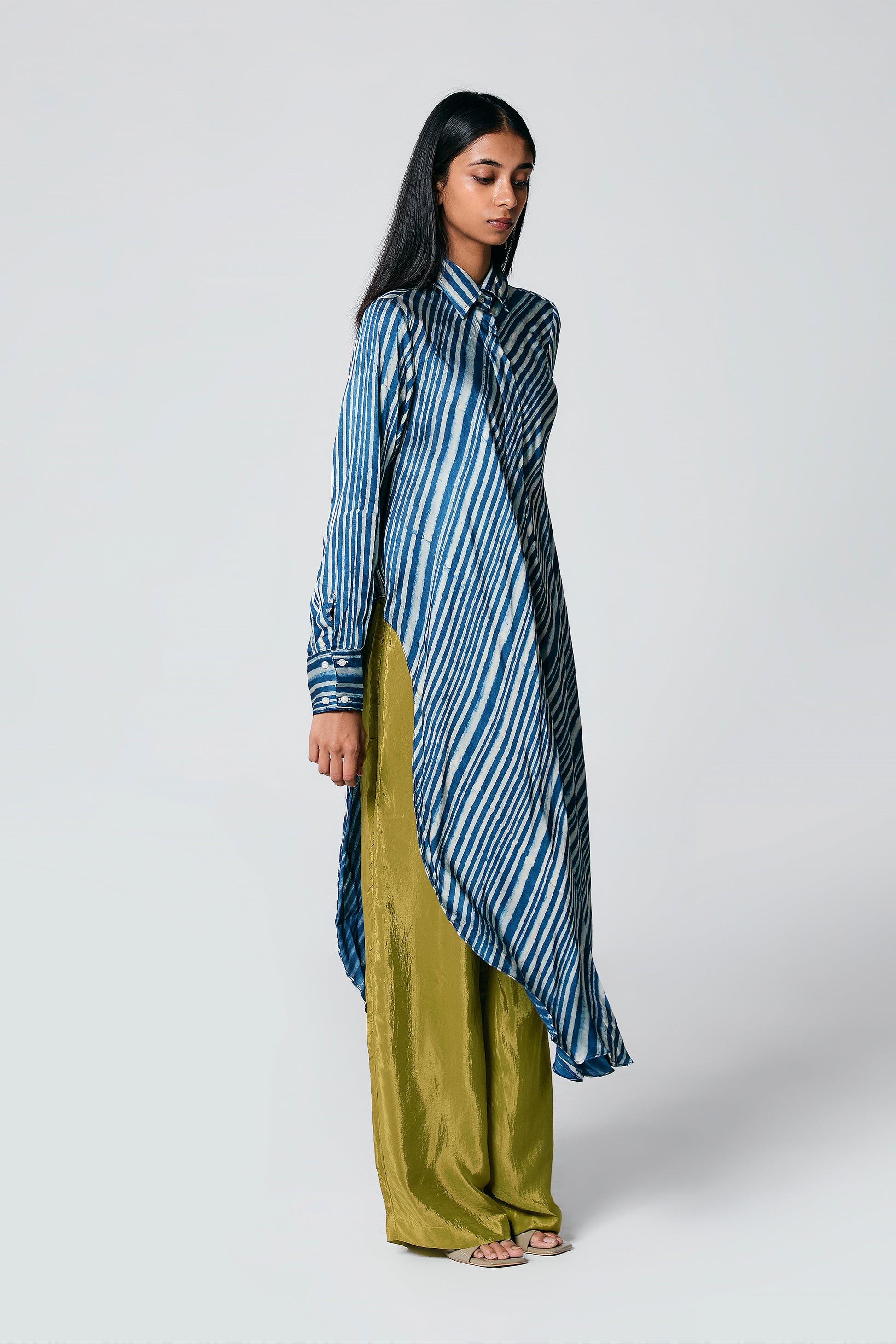 A modern silhouette with a handcrafted soul — this co-ord set features a striped Ajrakh hand block printed shirt, designed with a long front and low-cut sides for added movement. Paired with solid-coloured pants that subtly peek through, it’s a statement in contrast, comfort, and quiet drama.
