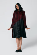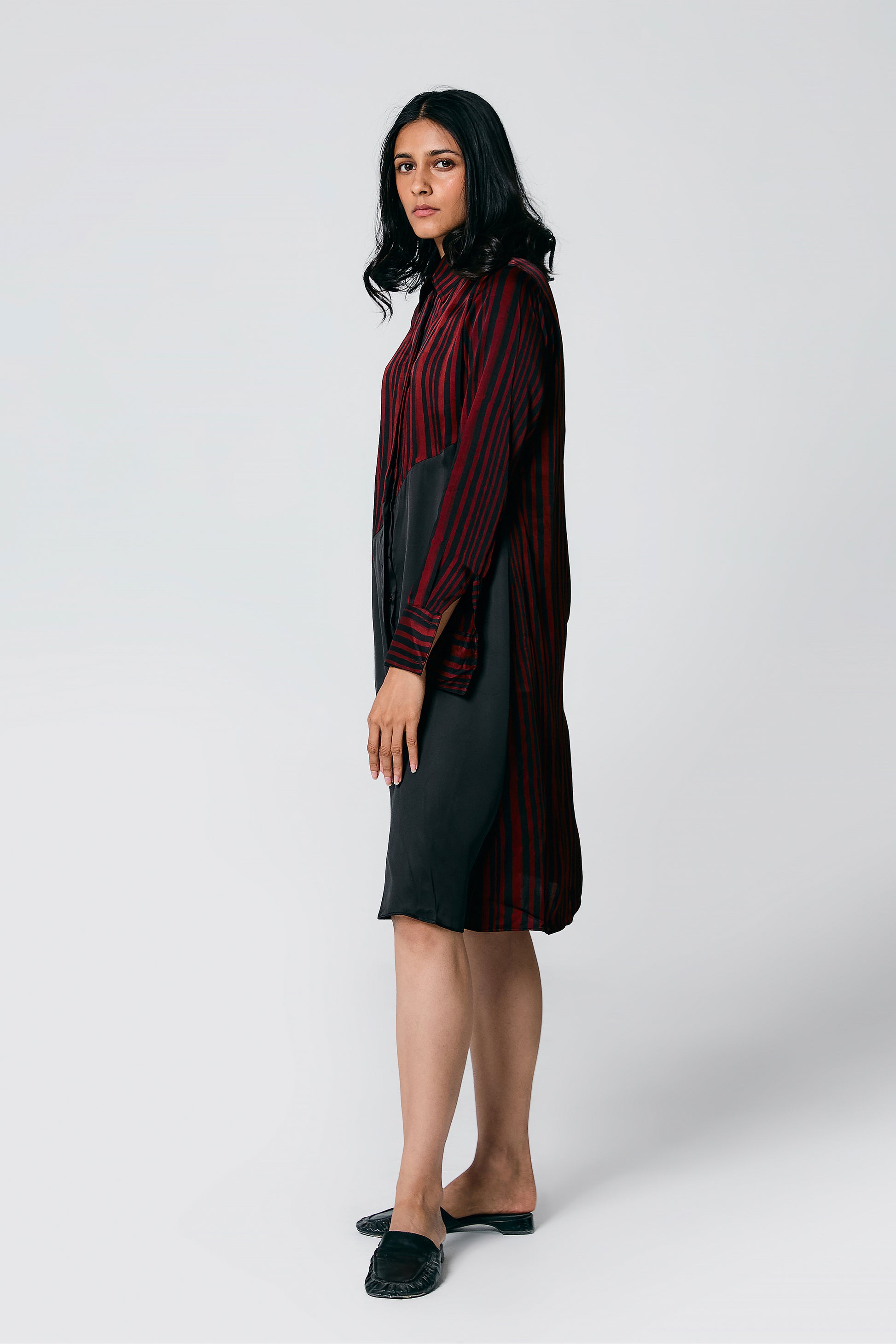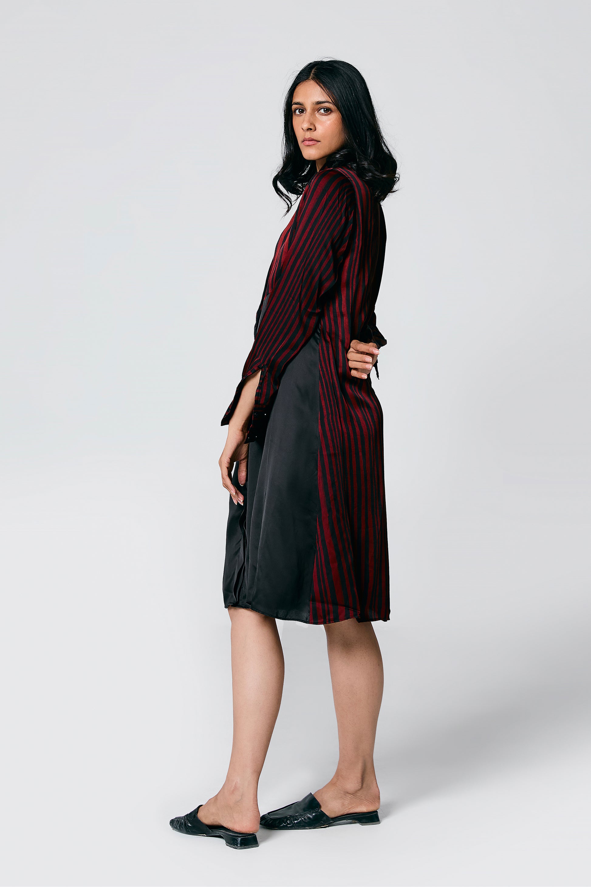 This contemporary shirt dress fuses clean tailoring with a dynamic twist, featuring bold Ajrakh stripes contrasted by a sleek diagonal solid panel. The button-down front and classic collar keep the look structured, while the knee-length cut and relaxed sleeves lend it easy, everyday elegance. A refined piece that transitions effortlessly from workwear to weekend.